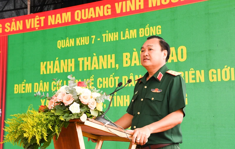 Trung tướng Trần Vinh Ngọc, Bí thư Đảng ủy, Chính ủy Quân khu phát biểu chúc mừng tại lễ khánh thành, bàn giao công trình “Điểm dân cư liền kề chốt dân quân biên giới” .