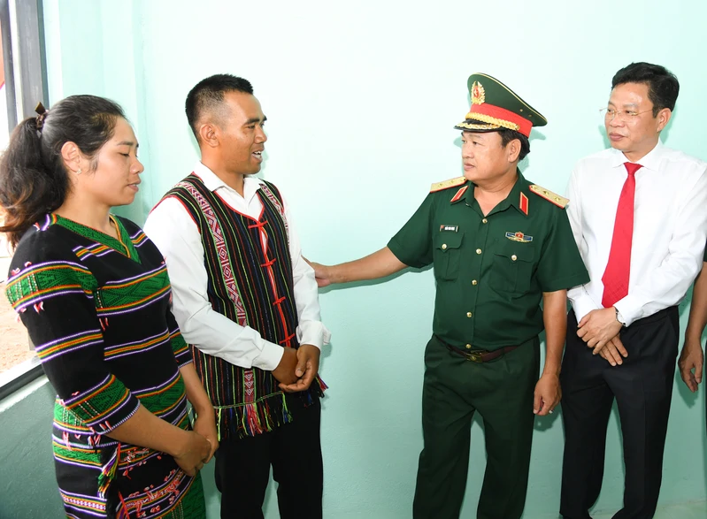 Thủ trưởng Bộ Tư lệnh Quân khu 7 và lãnh đạo tỉnh Lâm Đồng thăm, trò chuyện với các hộ gia đình trong căn nhà mới.