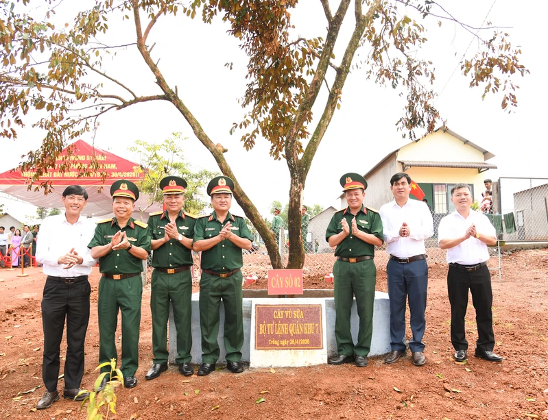 Trung tướng Trần Vinh Ngọc, Bí thư Đảng ủy, Chính ủy Quân khu 7 và các đại biểu trồng cây lưu niệm tại “Điểm dân cư liền kề chốt dân quân biên giới”.