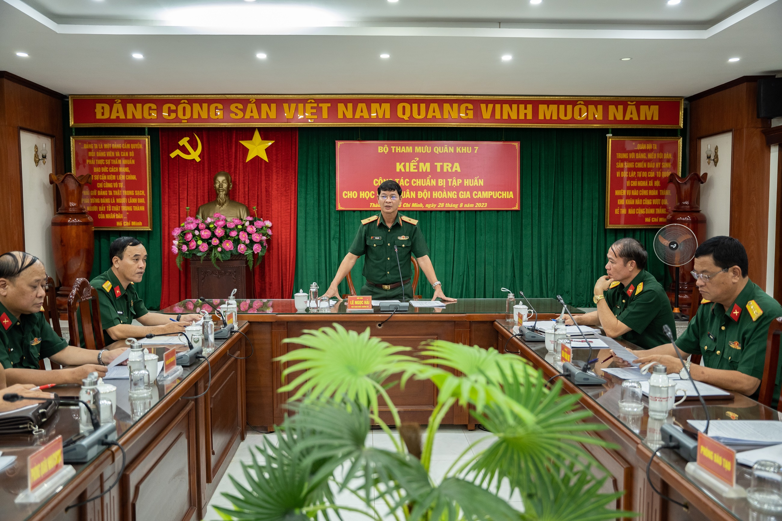 (QK7 Online) – Ngày 28/8, Đoàn kiểm tra Bộ Tư lệnh Quân khu 7 do Thiếu tướng Lê Ngọc Hải, Phó Tham mưu trưởng Quân khu làm trưởng đoàn đến kiểm tra công tác chuẩn bị tiếp nhận tập huấn Quân đội Hoàng gia Campuchia năm 2023. Dự buổi kiểm tra có Thủ trưởng các cơ quan Quân khu và Ban Giám hiệu Trường Quân sự Quân khu 7.