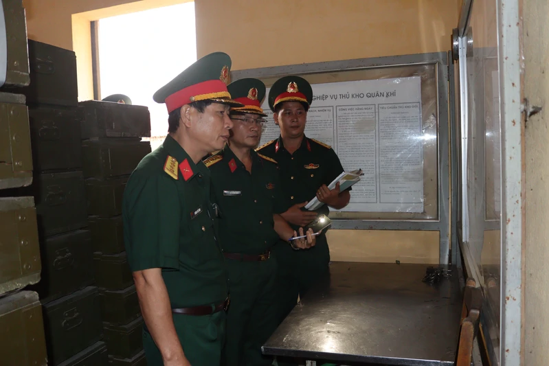 Đại tá Phùng Thế Hùng (bìa trái) kiểm tra kho vũ khí, đạn Tiểu đoàn 3.