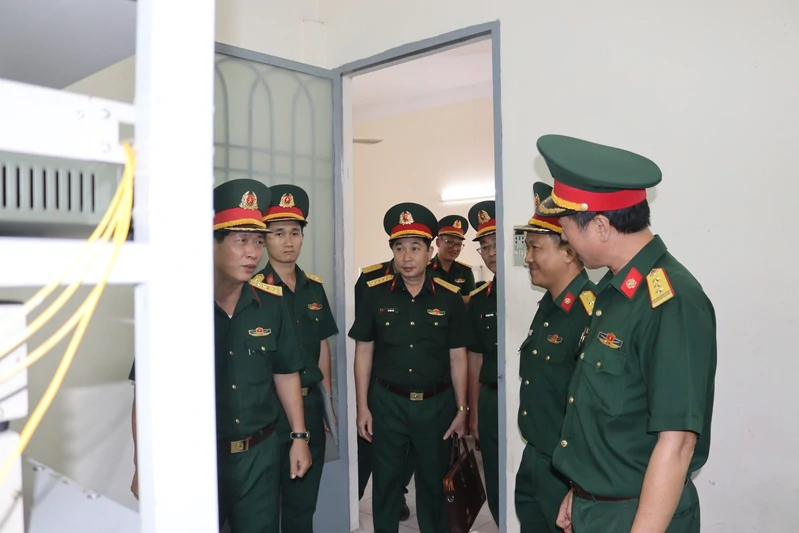 Đại tá Phùng Thế Hùng (ngoài cùng bên phải) và đoàn công tác kiểm tra Trạm A99K tại Tiểu đoàn 40, Lữ đoàn 23.
