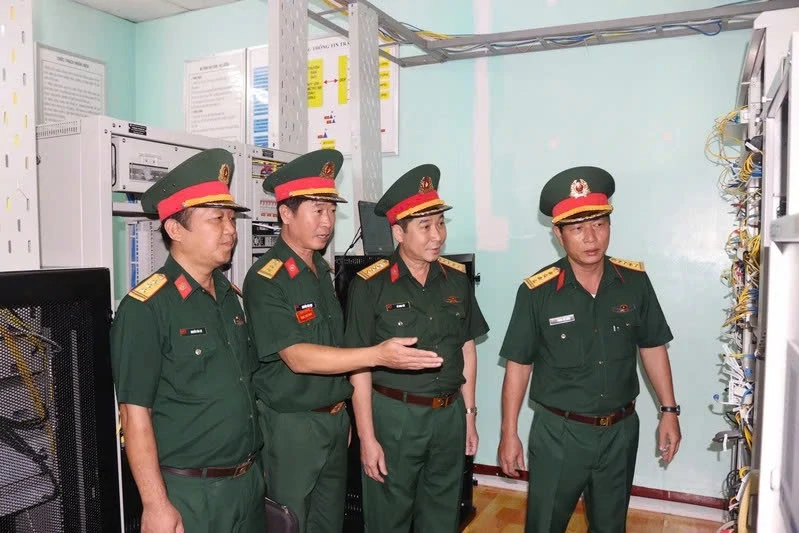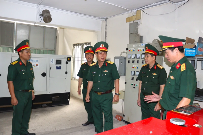 Đại tá Phùng Thế Hùng (giữa) kiểm tra Trạm nguồn tại Tiểu đoàn 40.
