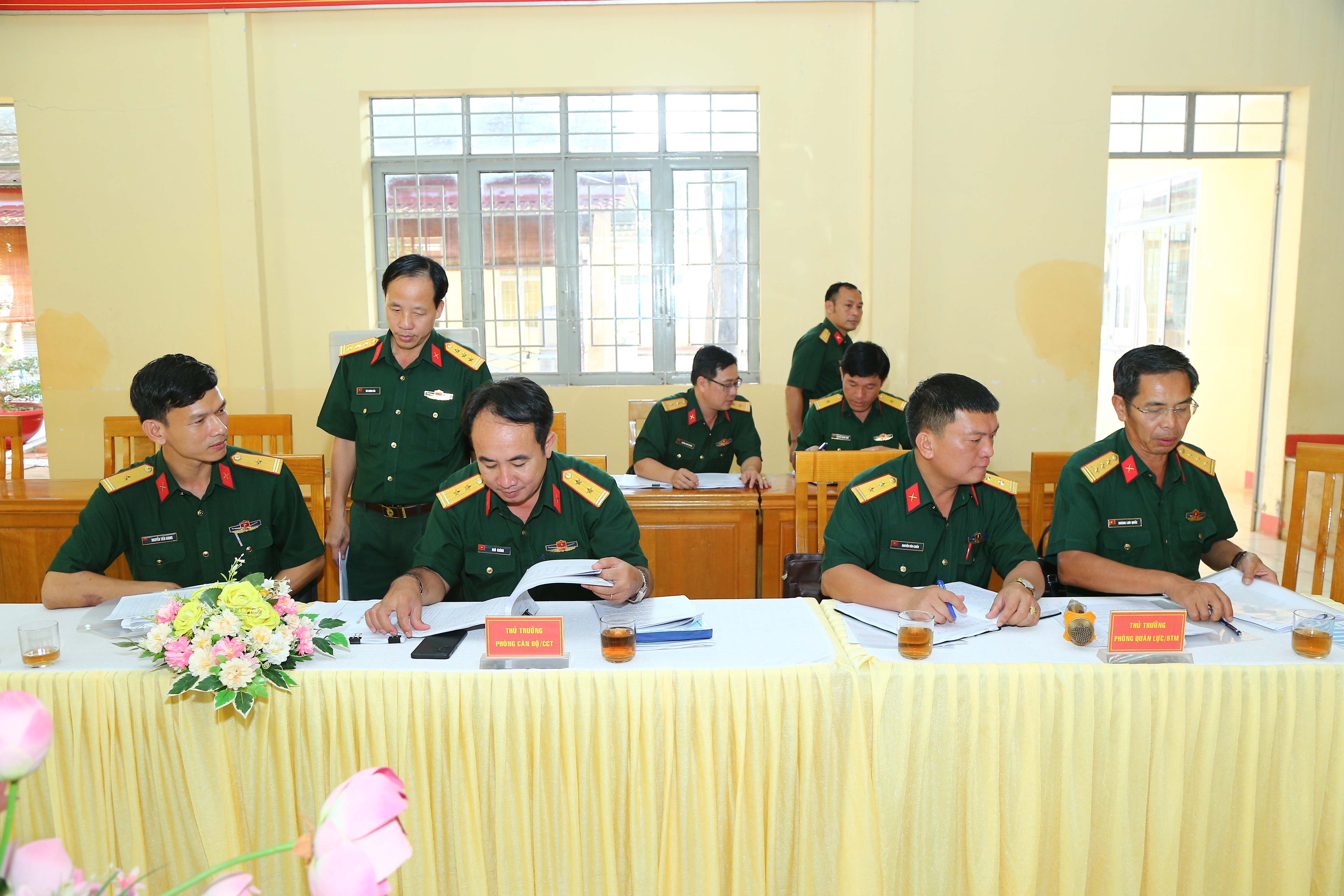 Thành viên đoàn công tác kiểm tra các văn kiện, kế hoạch chuẩn bị cho hội nghị ban hành biểu tổ chức, biên chế của Bộ CHQS tỉnh Bình Phước.