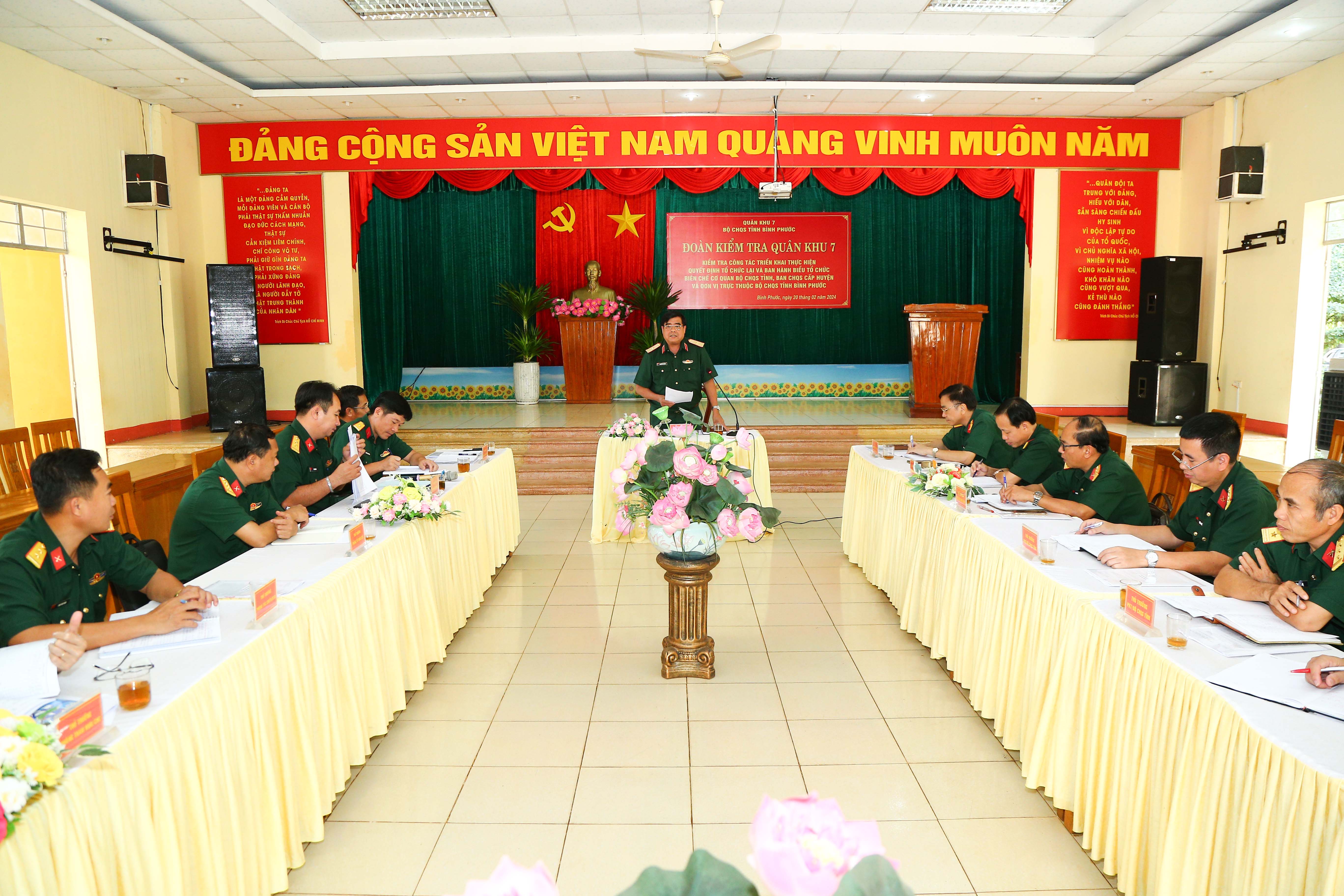 (QK7 Online) - Sáng 20/2, tại Trung đoàn 736, đoàn công tác Bộ Tư lệnh Quân khu 7 do Thiếu tướng Nguyễn Văn Hoàng, Phó Tham mưu trưởng Quân khu làm trưởng đoàn đến kiểm tra công tác triển khai thực hiện quyết định tổ chức lại và ban hành biểu tổ chức, biên chế cơ quan Bộ CHQS tỉnh, Ban CHQS cấp huyện và đơn vị trực thuộc Bộ CHQS tỉnh Bình Phước.