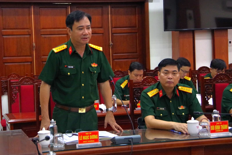 Đại tá Lê Ngọc Dương, Hiệu trưởng Trường Quân sự Quân khu 7 phát biểu tại hội nghị.