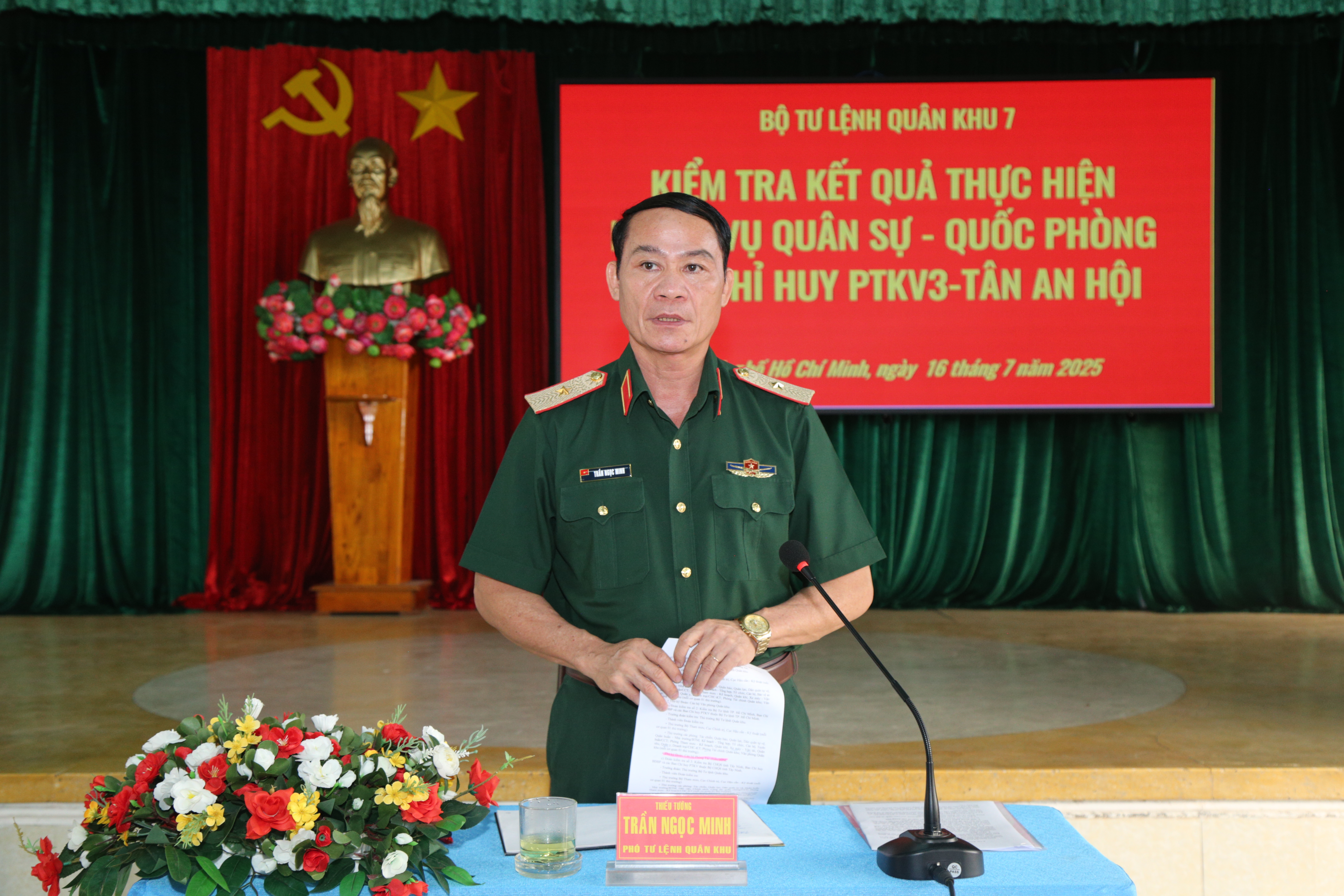 (QK7 Online) - Ngày 16/7, đoàn công tác của Bộ Tư lệnh Quân khu 7 do Thiếu tướng Trần Ngọc Minh, Phó Tư lệnh Quân khu làm trưởng đoàn đã đến kiểm tra, nắm tình hình thực hiện nhiệm vụ quân sự, quốc phòng Ban chỉ huy Phòng thủ khu vực (CHPTKV) trực thuộc Bộ Tư lệnh Thành phố Hồ Chí Minh.