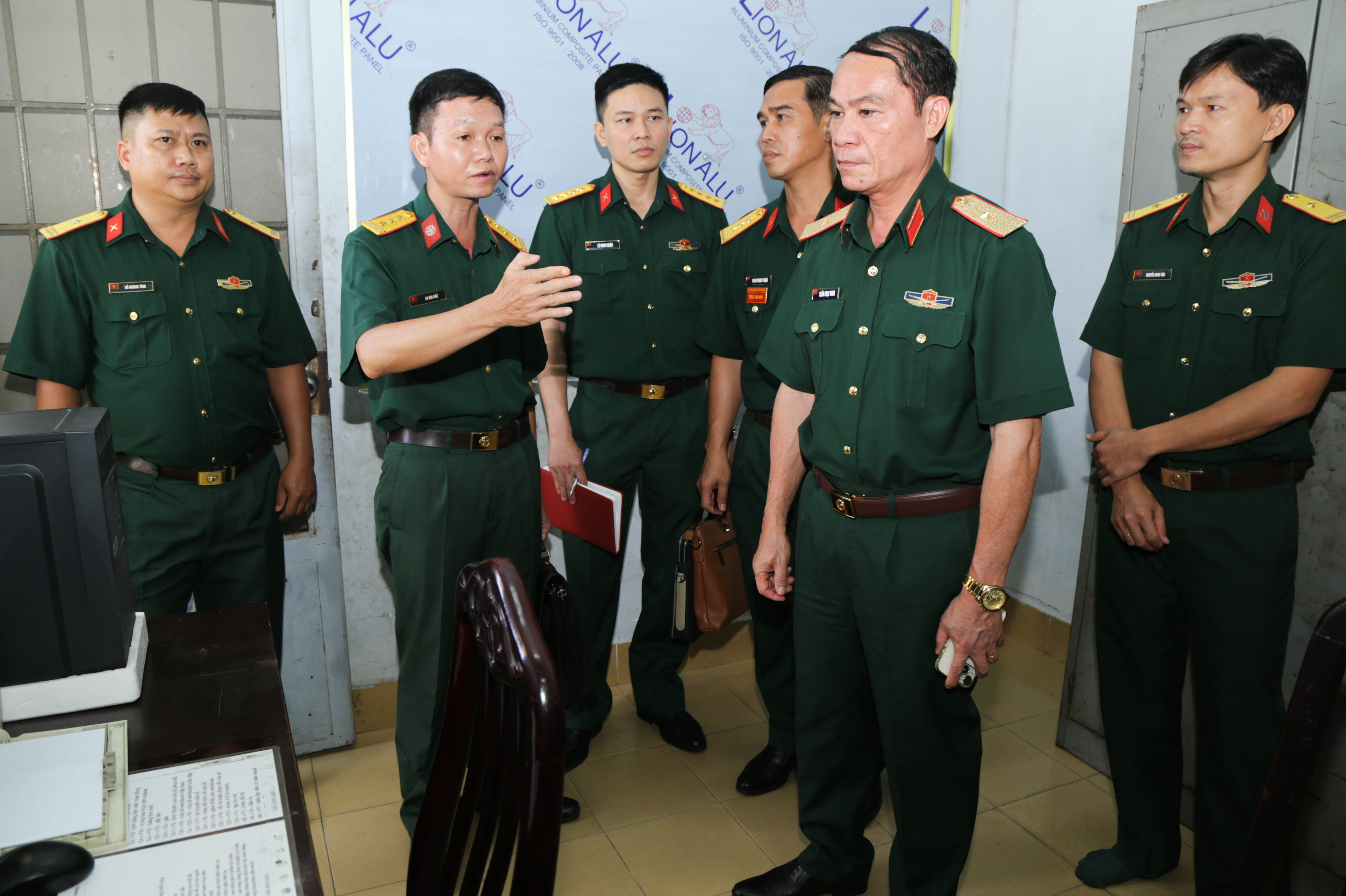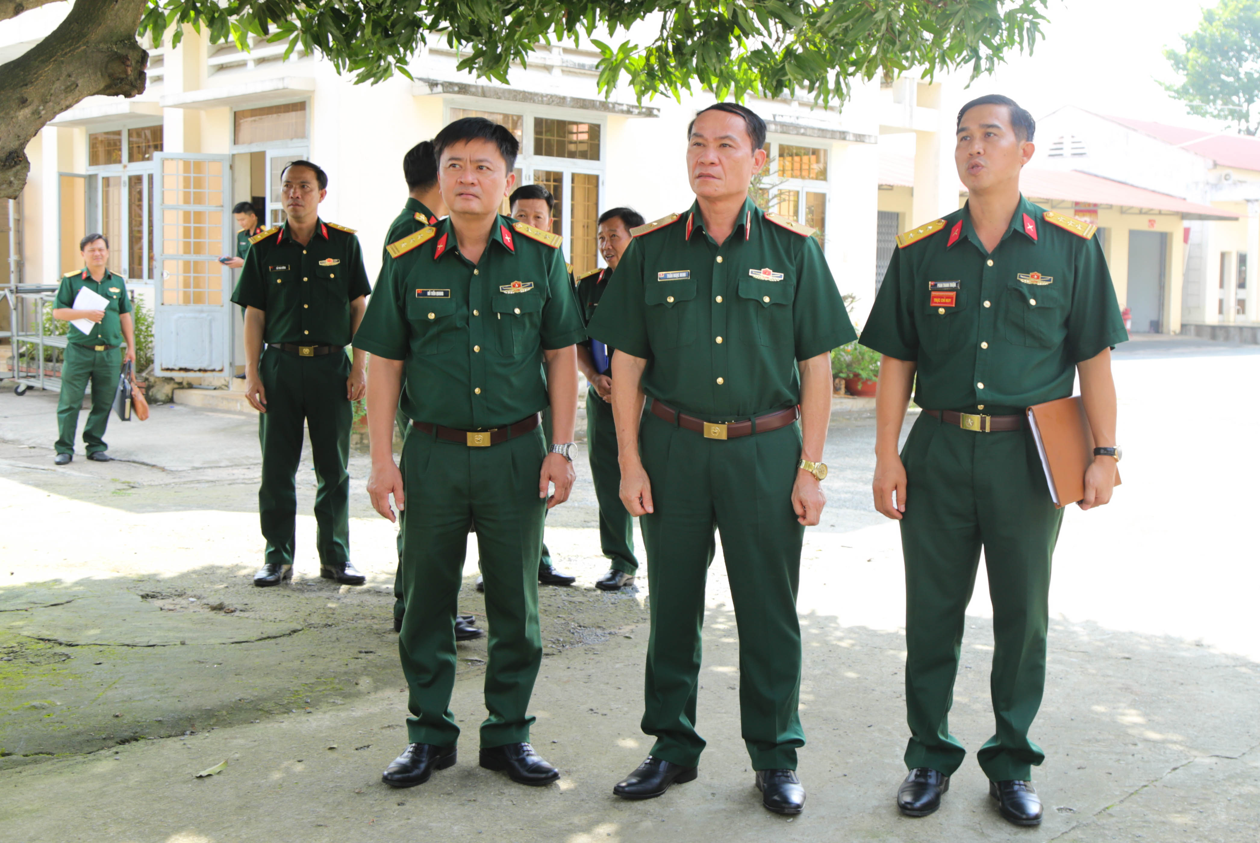 Đại tá Trần Đức Thắng, Phó Chủ nhiệm Chính trị Quân khu (ngoài cùng bên phải) và thủ trưởng các cơ quan Quân khu tham gia đoàn kiểm tra.