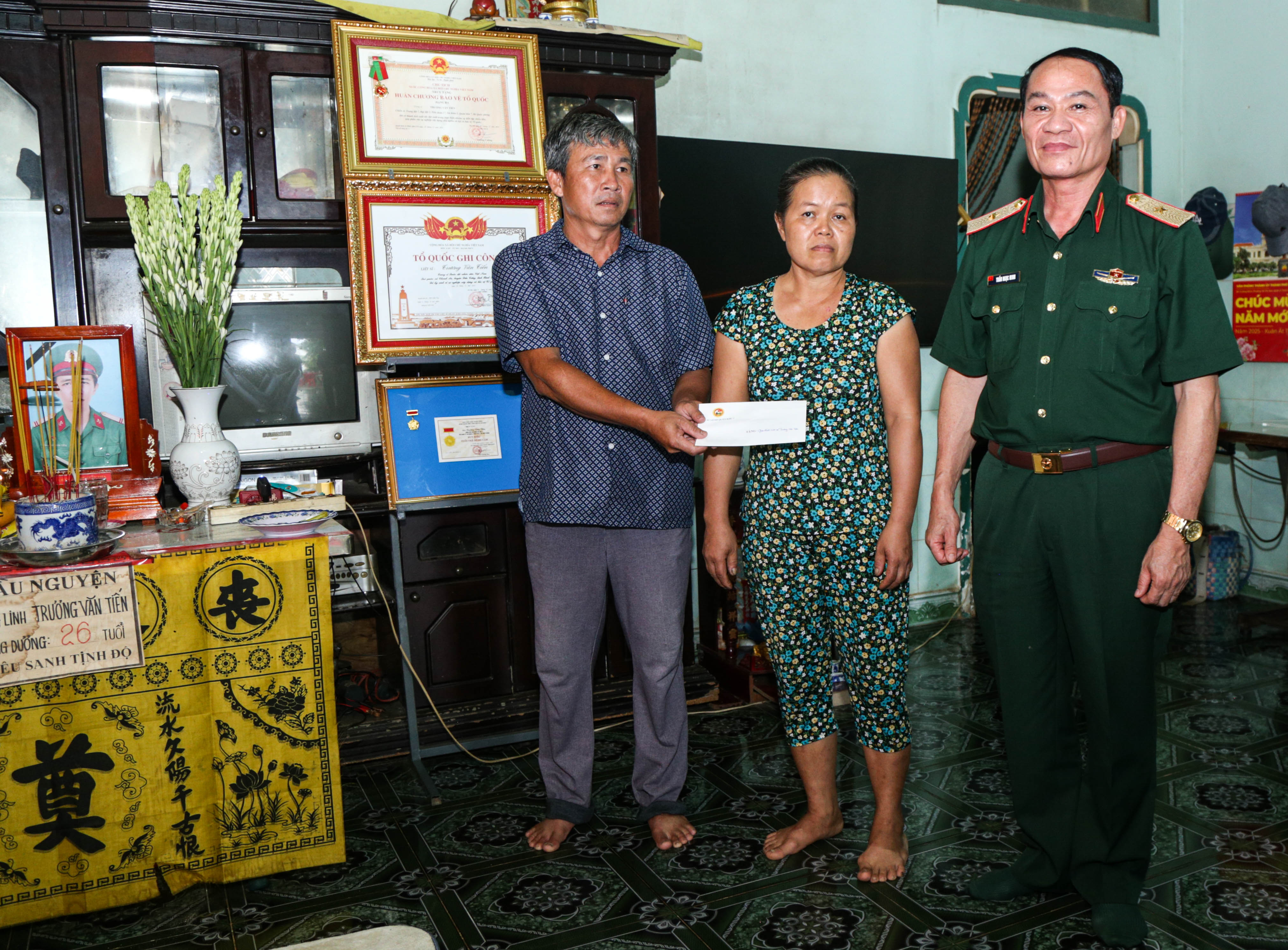 Thiếu tướng Trần Ngọc Minh và đoàn công tác Quân khu đến thắp hương tri ân, tặng quà gia đình Liệt sĩ Trương Văn Tiến.