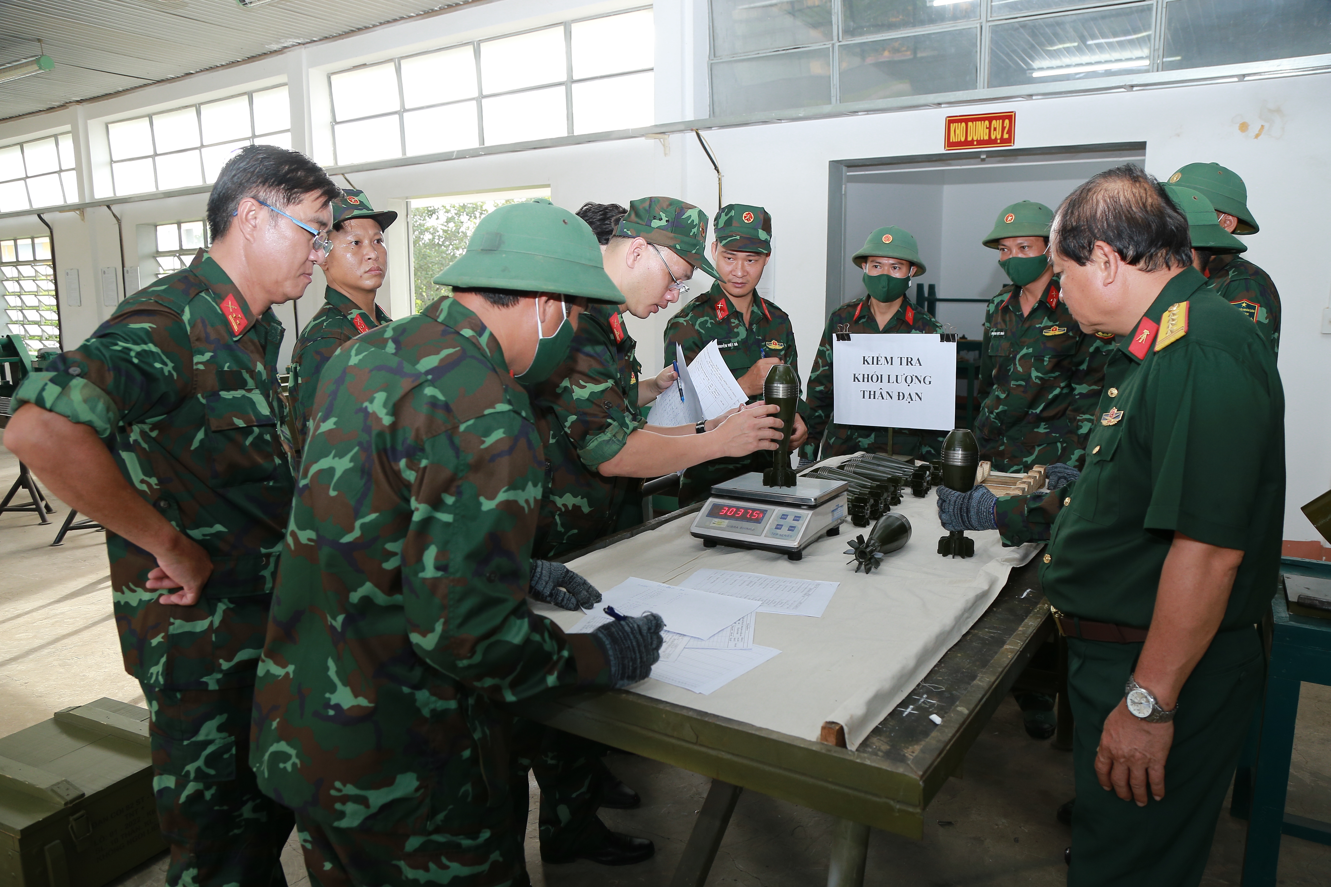 Hội đồng nghiệm thu cấp Quân khu và đại diện các cơ quan Bộ Quốc phòng tiến hành kiểm tra hòm gỗ bao gói, bảo quản, ký hiệu; kiểm tra mặt ngoài thân đạn không được móp méo, biến dạng, nứt, xước, bong tróc sơn, thân đạn được sơn màu xanh quân sự; kiểm tra kích thước đai tâm, chiều dài viên đạn, phân bố cánh đuôi, lỗ lắp liều chính, ren lỗ lắp ngòi, độ sâu bề mặt thuốc nổ; kiểm tra lọt lòng viên đạn…