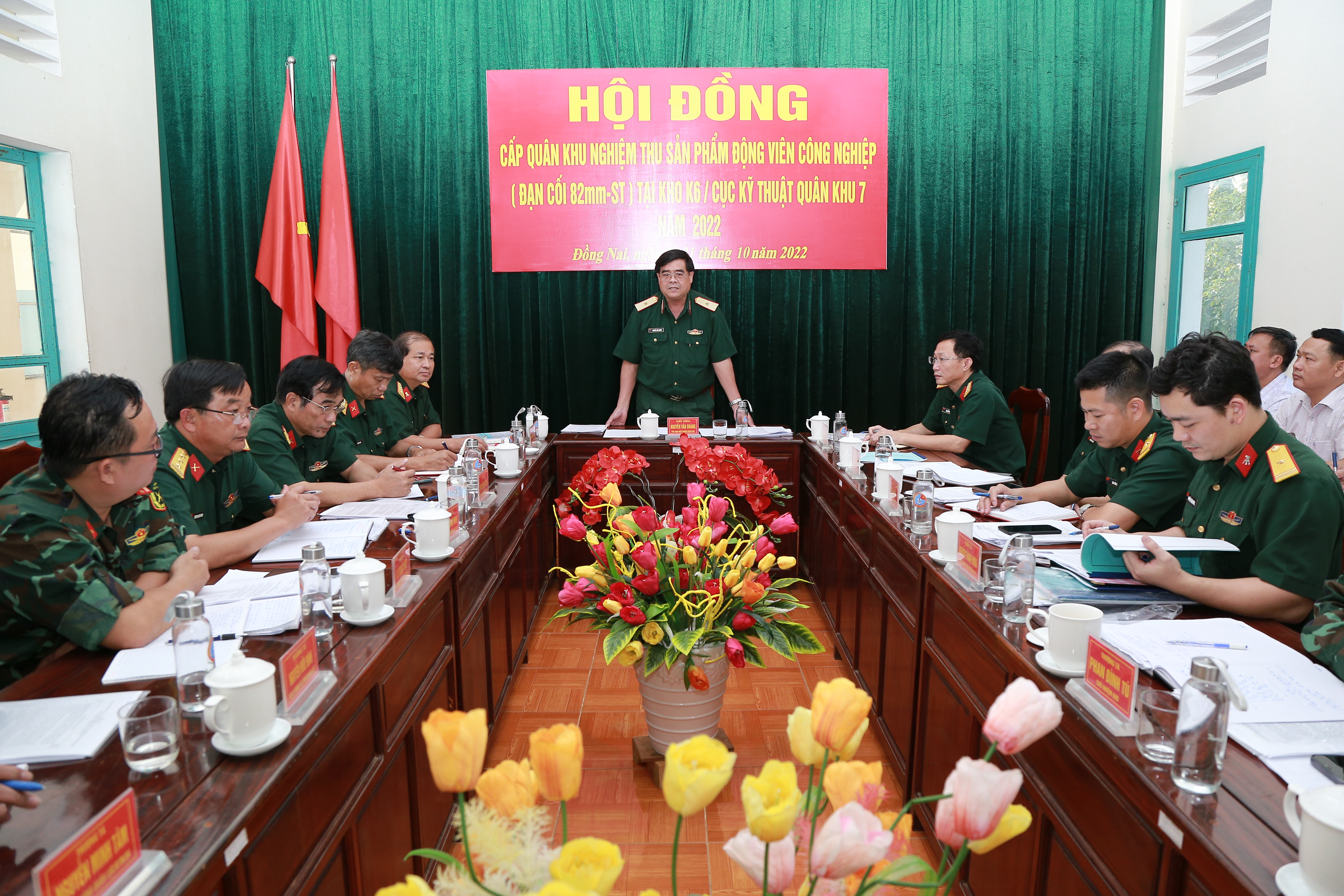 (QK7 Online) - Chiều 30-10, tại Kho K6, Cục Kỹ thuật Quân khu 7, Hội đồng nghiệm thu cấp Quân khu tổ chức nghiệm thu tĩnh sản phẩm động viên công nghiệp (đạn cối 82mm-ST) năm 2022. Thiếu tướng Nguyễn Văn Hoàng, Phó Tham mưu trưởng Quân khu, Phó Chủ tịch Hội đồng nghiệm thu cấp Quân khu chủ trì. Tham gia nghiệm thu có đại diện các cơ quan Bộ Quốc phòng.