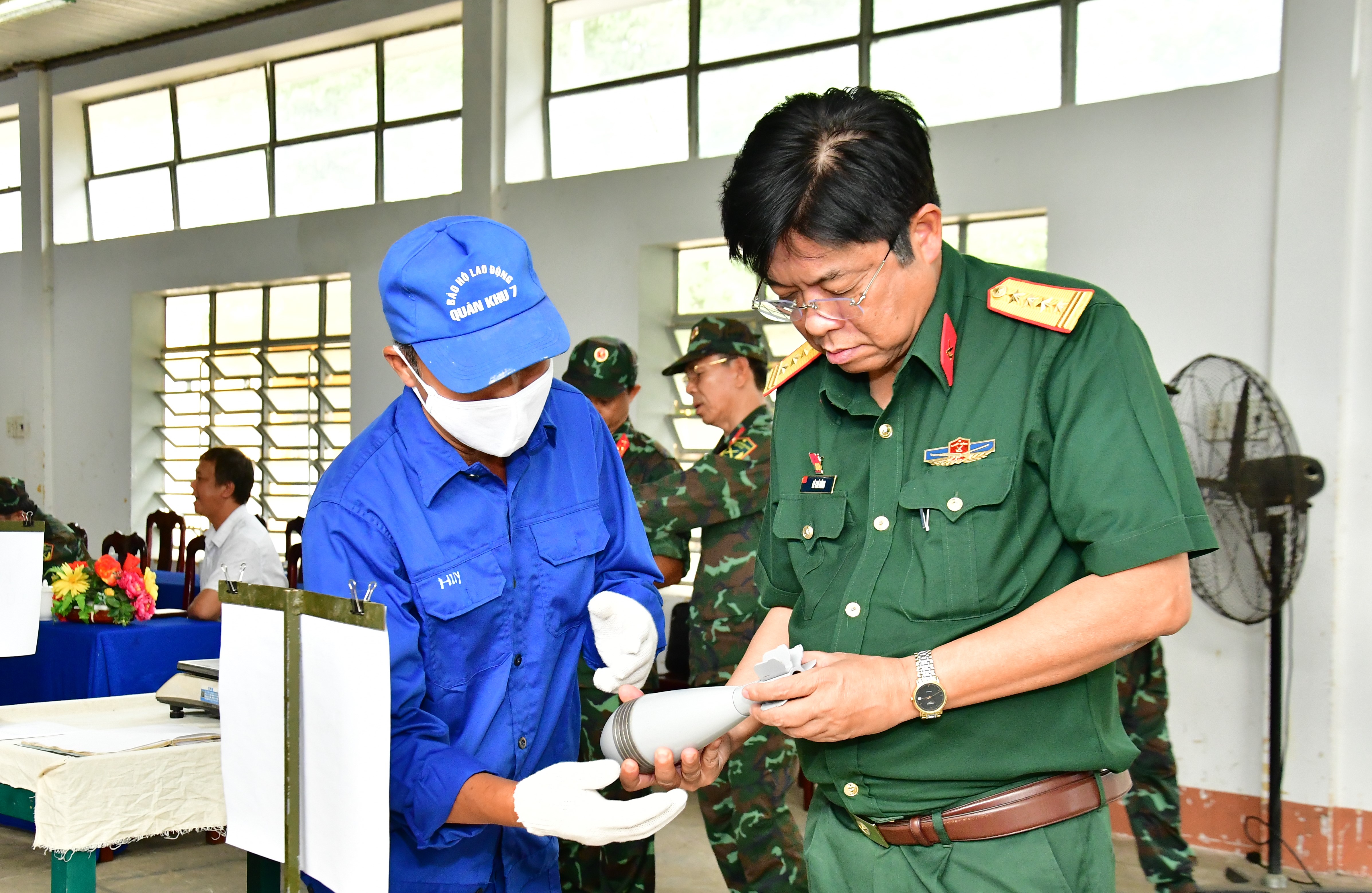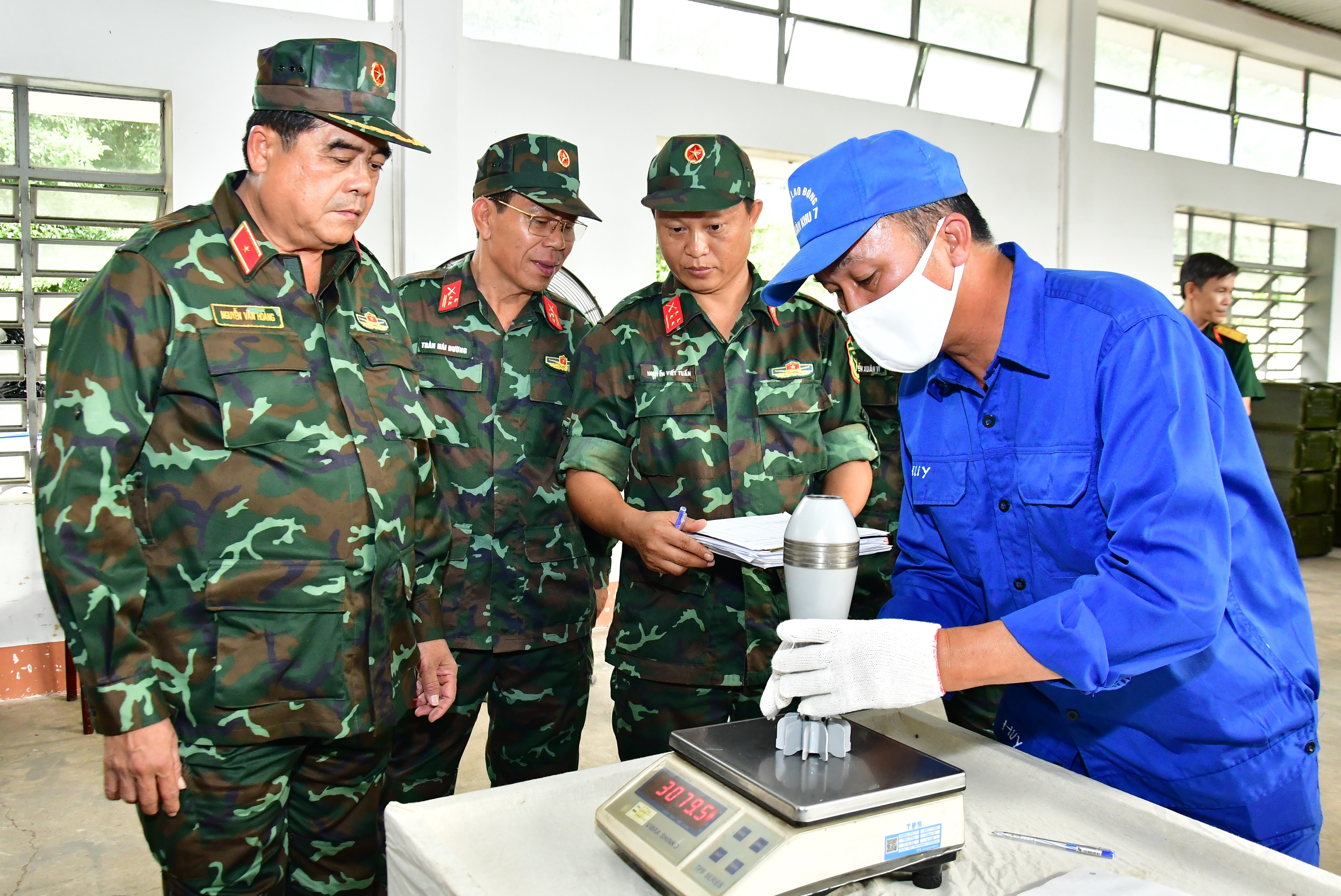 Thiếu tướng Nguyễn Văn Hoàng, Phó Tham mưu trưởng Quân khu 7 kiểm tra khối lượng thân đạn cối 82mm