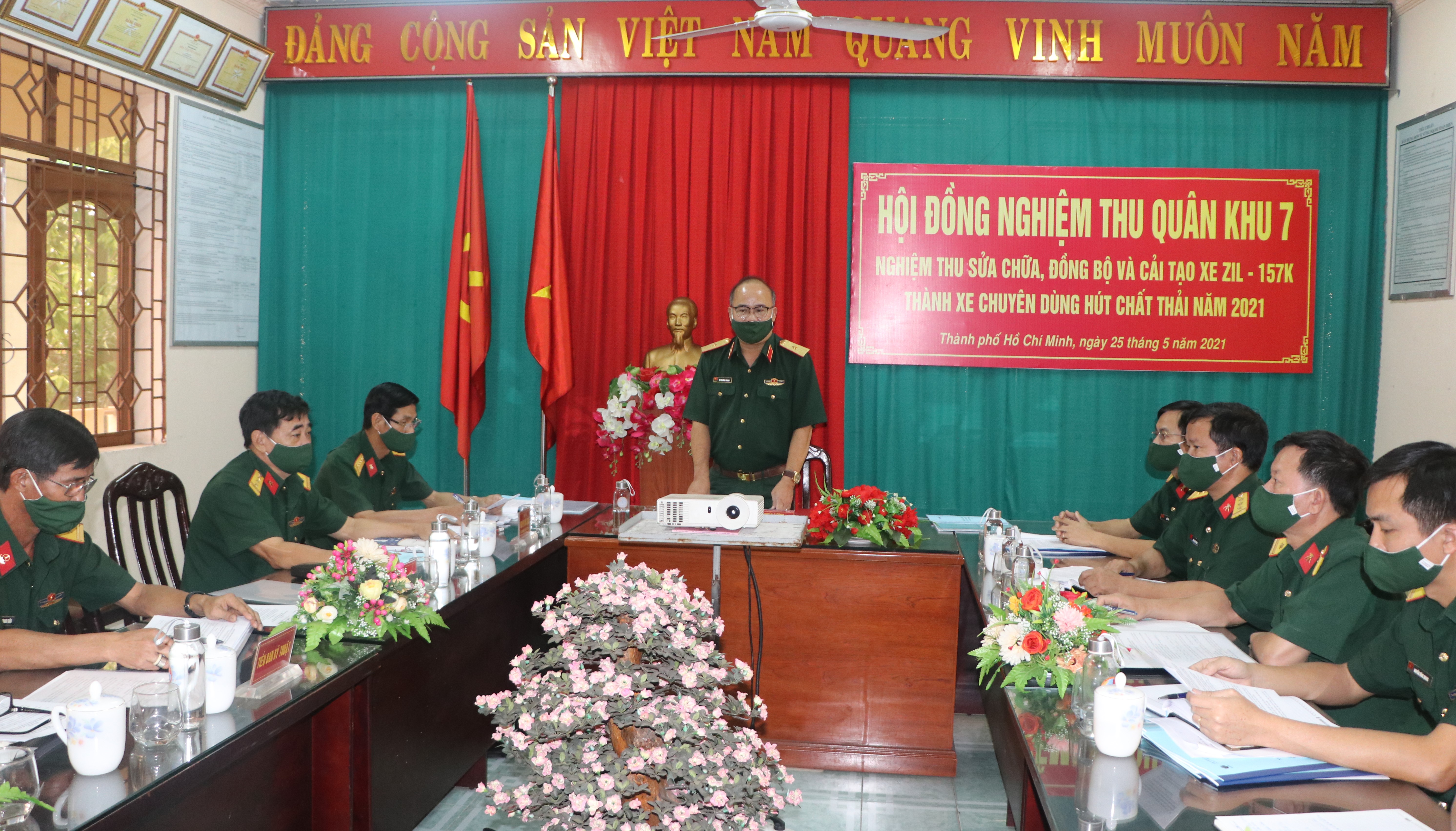 (QK7 Online) - Ngày 25/5, tại Xưởng Z735, Cục Kỹ thuật Quân khu, Hội đồng nghiệm thu Quân khu tổ chức nghiệm thu sửa chữa đồng bộ và cải tạo xe ZIL-157K thành xe chuyên dùng hút chất thải. Thiếu tướng Du Trường Giang, Phó Tư lệnh Quân khu dự và chỉ đạo nghiệm thu.
