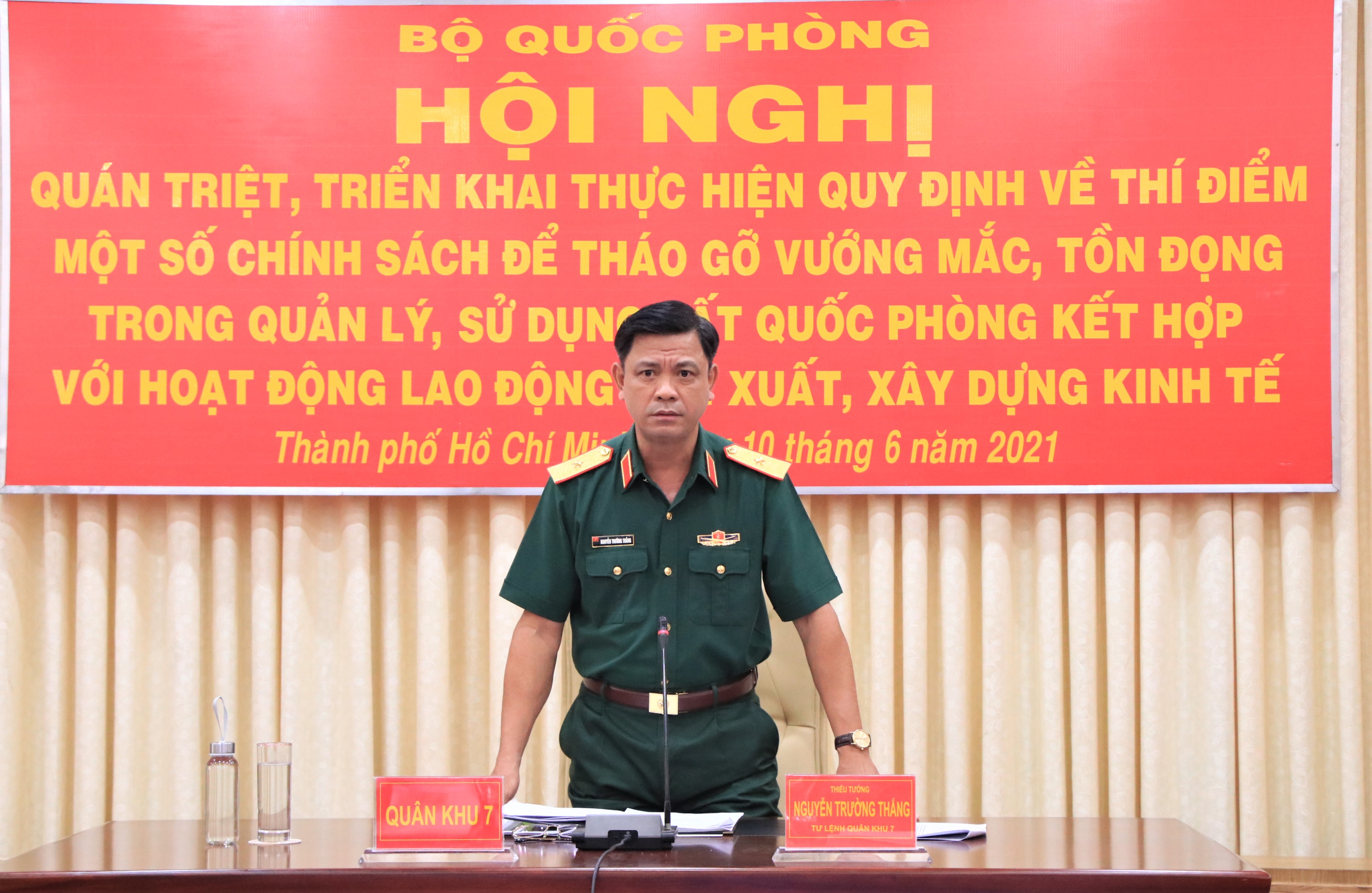 Phát biểu tại hội nghị, Thiếu tướng Nguyễn Trường Thắng, UVTW Đảng, Tư lệnh Quân khu 7 bày tỏ sự thống nhất cao những chỉ đạo kịp thời của Bộ Quốc phòng trong việc tháo gỡ khó khăn, vướng mắc liên quan đến vấn đề đất quốc phòng hiện nay.