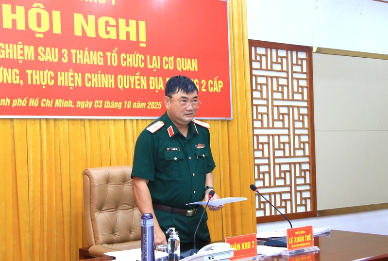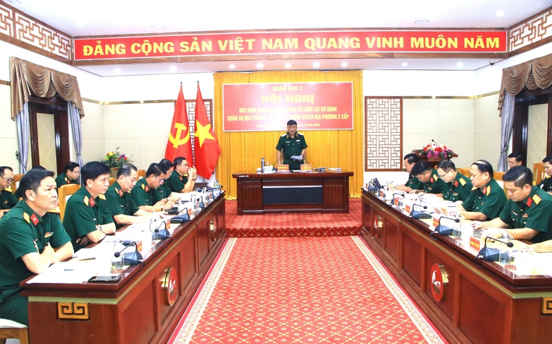 (QK7 Online) - Ngày 3/10, Bộ Tư lệnh Quân khu 7 tổ chức hội nghị rút kinh nghiệm sau 3 tháng tổ chức lại cơ quan quân sự địa phương gắn với thực hiện chính quyền địa phương 2 cấp bằng hình thức trực tiếp và trực tuyến đến các điểm cầu: Bộ Tư lệnh Thành phố Hồ Chí Minh; Bộ CHQS các tỉnh Đồng Nai, Lâm Đồng, Tây Ninh và Ban chỉ huy Phòng thủ khu vực các tỉnh. Tại điểm cầu Sở chỉ huy Quân khu, Thiếu tướng Lê Xuân Thế, Tư lệnh Quân khu chủ trì hội nghị. Tham dự hội nghị có Thiếu tướng Trần Vinh Ngọc, Bí thư Đảng ủy, Chính ủy Quân khu; các đồng chí trong Thường vụ Đảng ủy, Bộ Tư lệnh Quân khu; thủ trưởng các cơ quan, các phòng chức năng Quân khu và Trường Quân sự Quân khu.