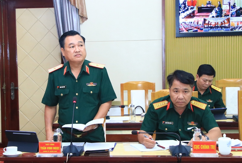 Đại tá Nguyễn Hồng Cảnh, Phó Chủ nhiệm Chính trị Quân khu phát biểu tại hội nghị.
