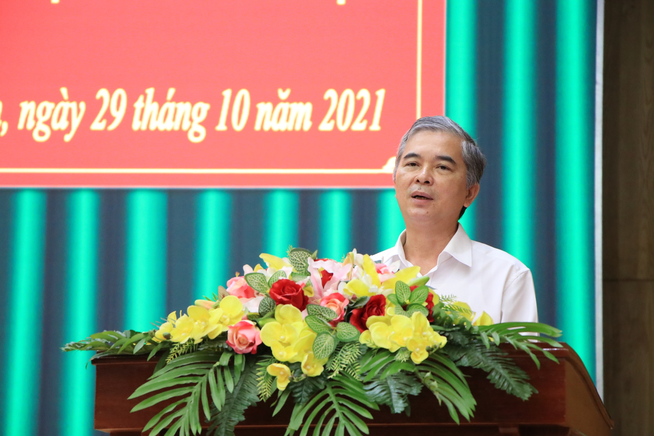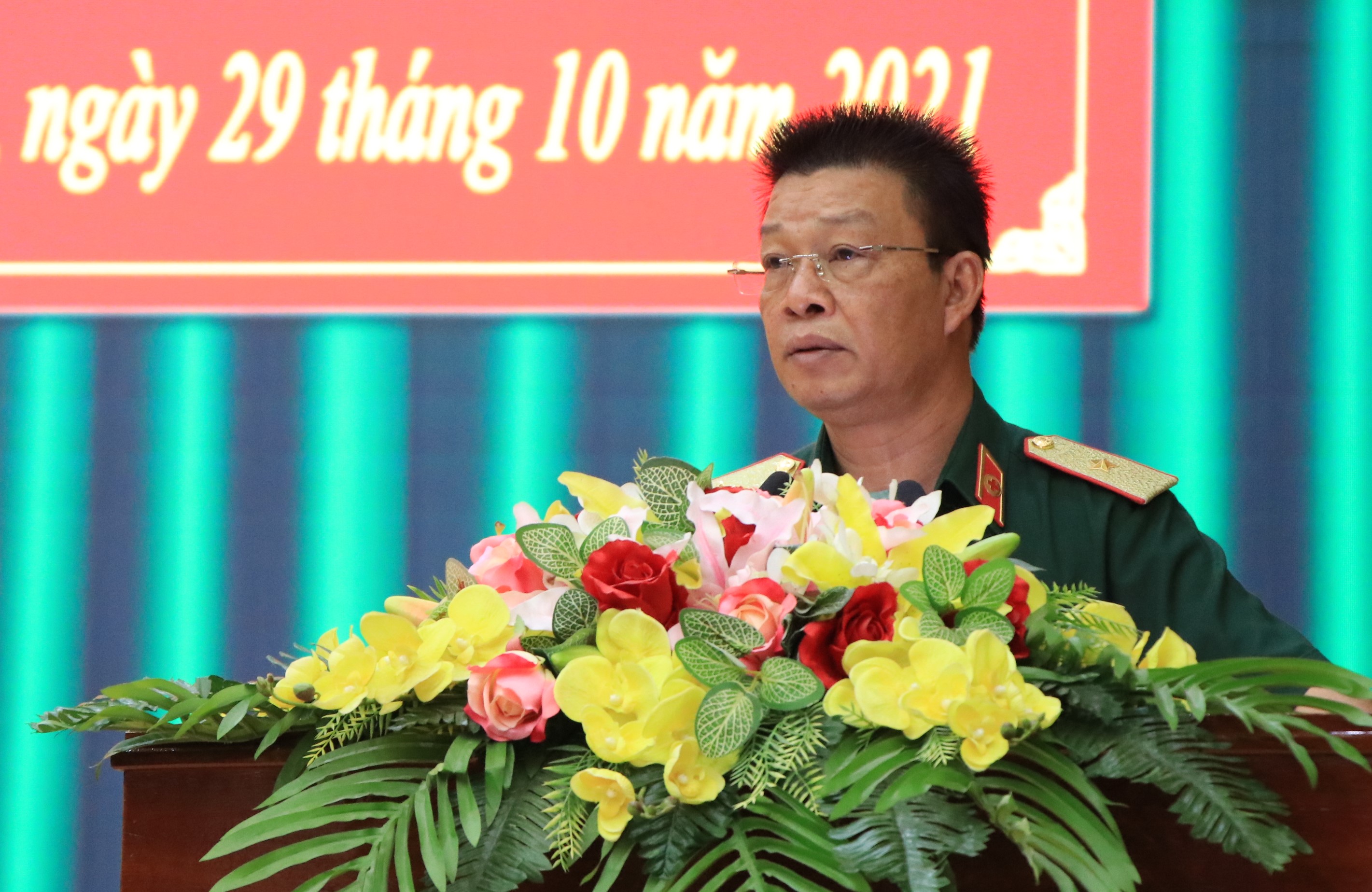 Đại tá Huỳnh Tấn Hùng, Chủ nhiệm Hậu cần Quân khu báo cáo kết quả thực hiện nhiệm vụ phòng chống dịch đợt 4 của LLVT Quân khu.