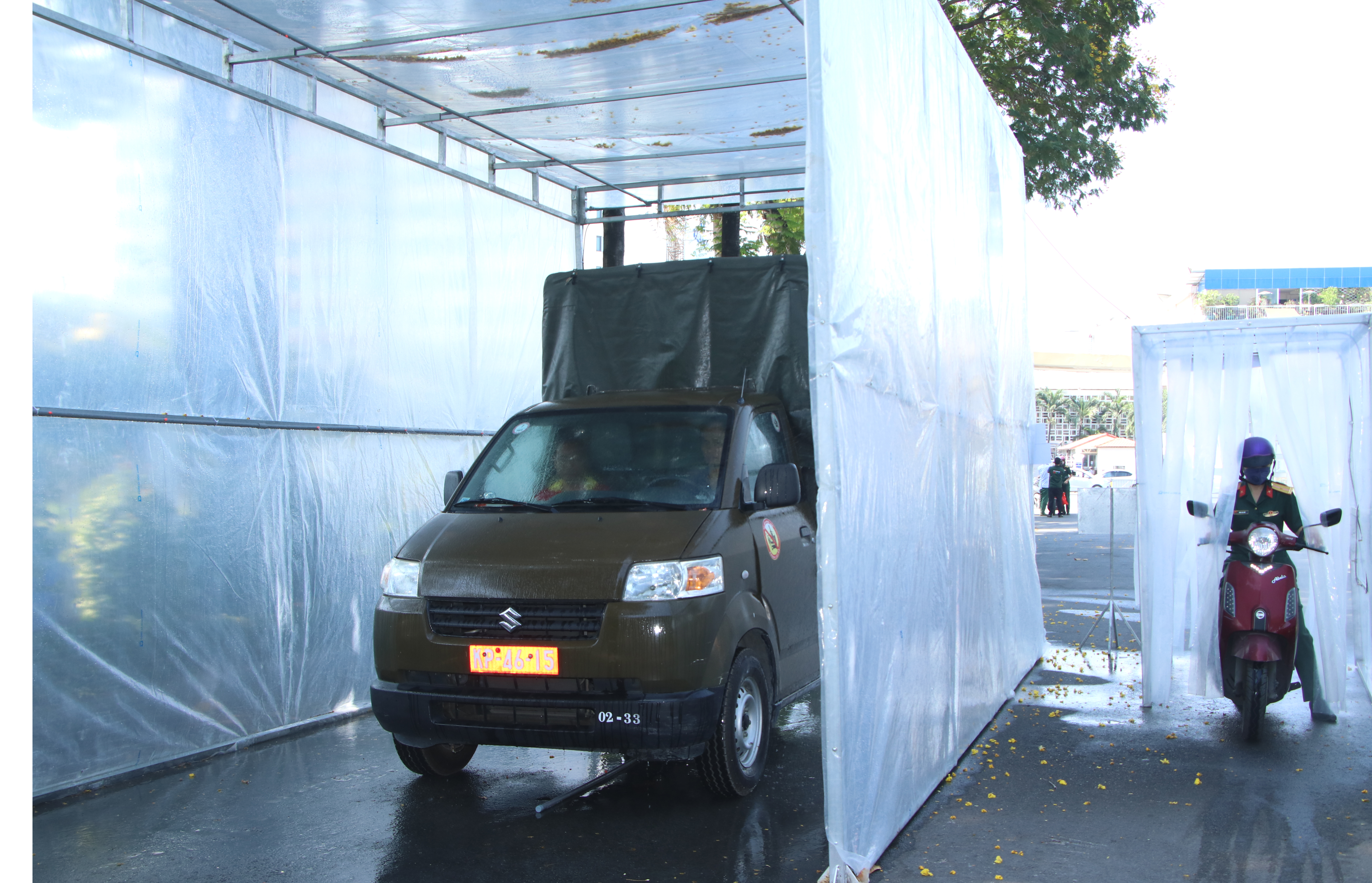 Lực lượng quân y Quân khu Bộ chuẩn bị khu vực khử khuẩn phương tiện vào căn cứ Trần Hưng Đạo.