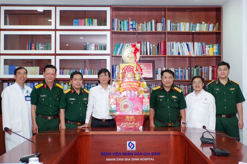 Đại tá Nguyễn Hồng Cảnh (thứ 3 bên phải) và đoàn công tác đến thăm, chúc Tết Bệnh viện Nhân dân Gia Định.