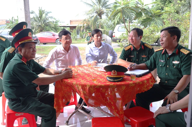 Đoàn công tác trao đổi với lãnh đạo địa phương nắm tình hình tiến độ xây dựng Nhà tình nghĩa quân - dân tại ấp Hòa Tây, xã Đức Huệ, tỉnh Tây Ninh.