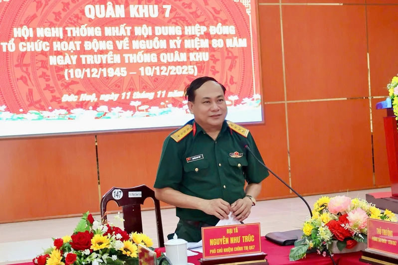 (QK7 Online) – Ngày 11/11, Quân khu 7 tổ chức Hội nghị thống nhất nội dung hiệp đồng tổ chức hoạt động về nguồn kỷ niệm 80 năm Ngày truyền thống Quân khu (10/12/1945 – 10/12/2025). Đại tá Nguyễn Như Trúc, Phó Chủ nhiệm Chính trị Quân khu chủ trì hội nghị.