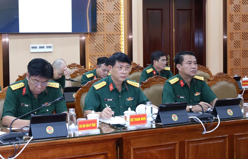 Đại tá Nguyễn Tấn Linh, Ủy viên Đảng ủy, Phó Tư lệnh Quân khu (bìa phải) cùng thủ trưởng Bộ Tham mưu, Cục HC-KT dự hội nghị.