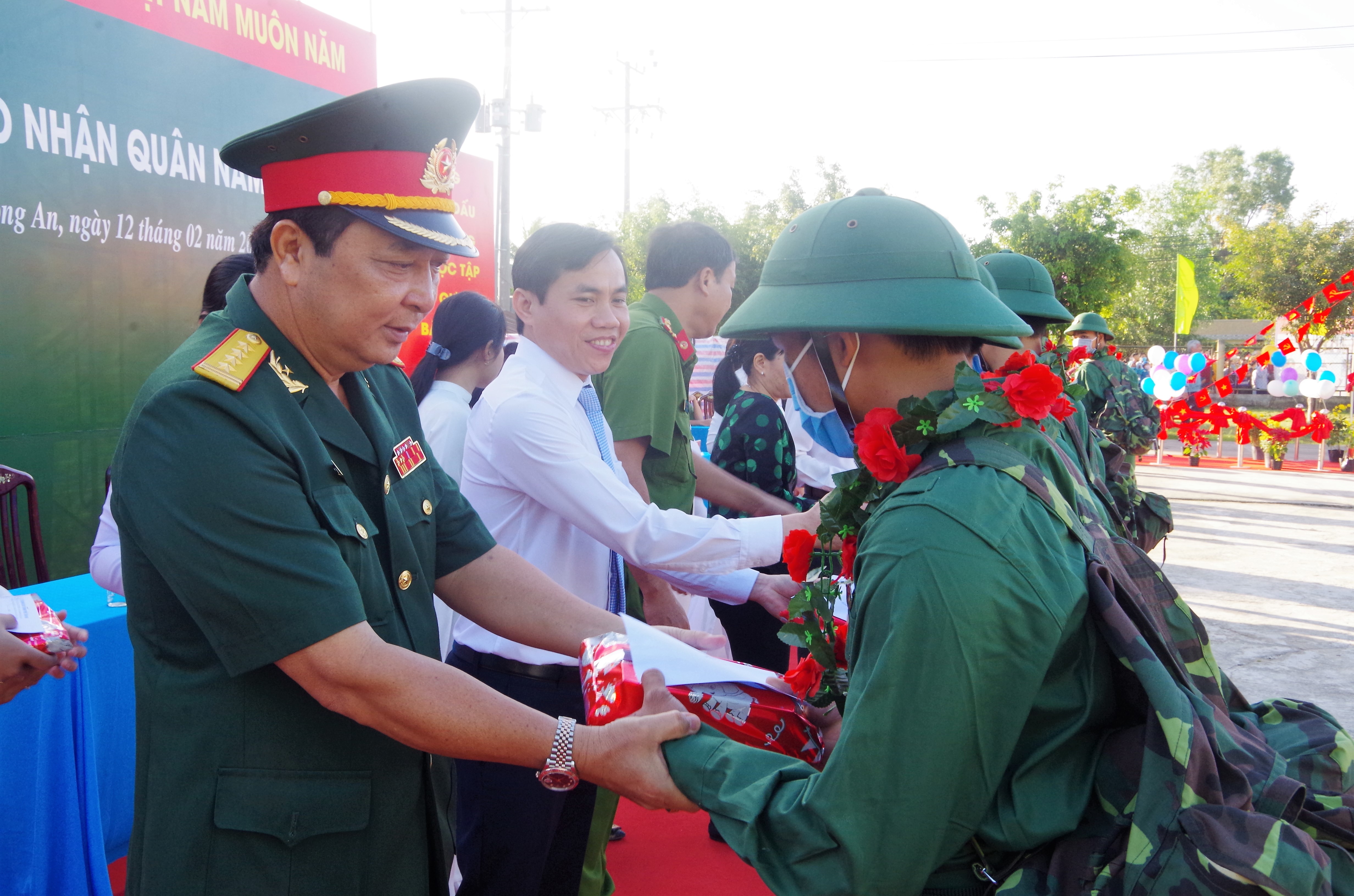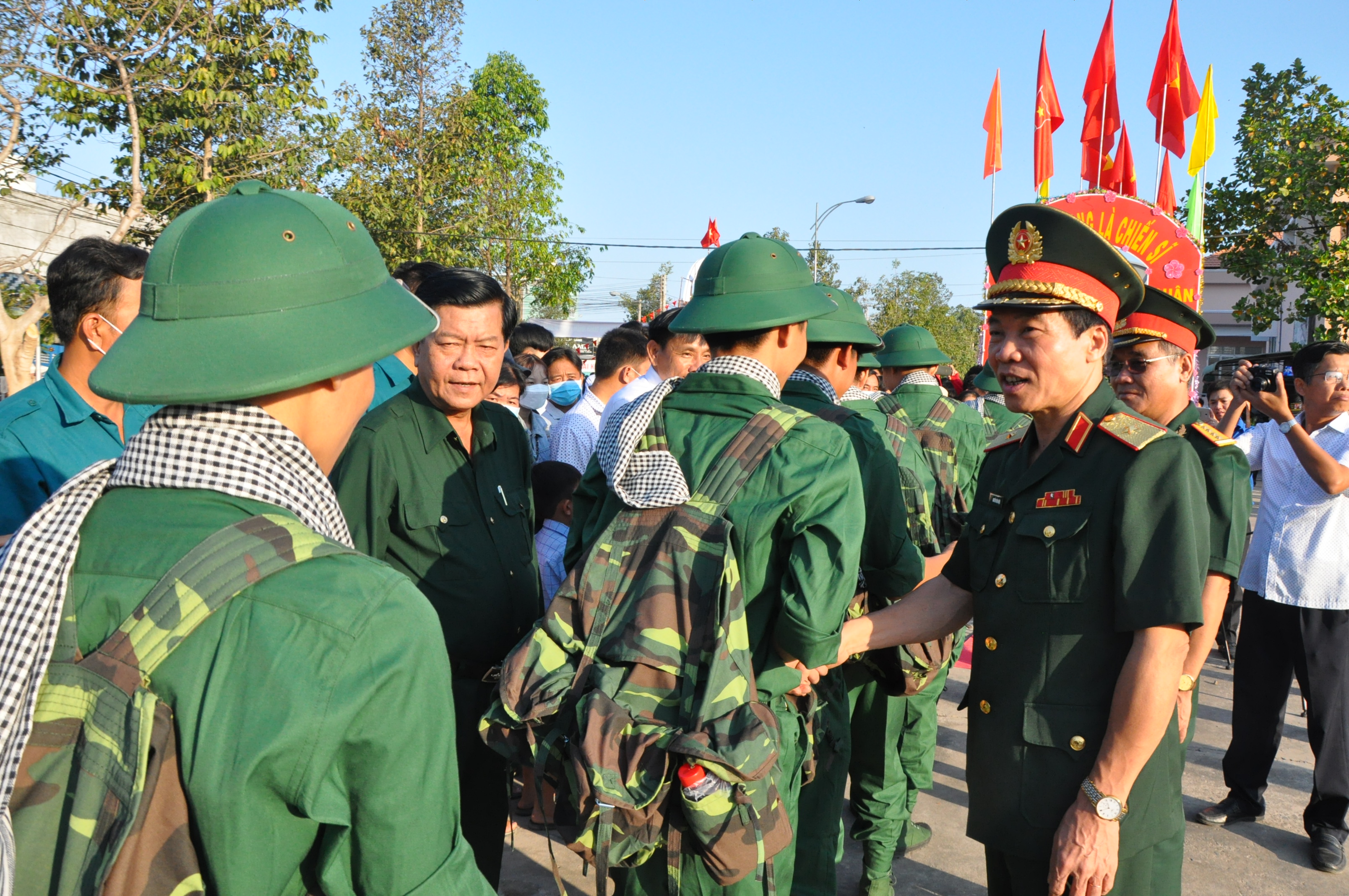 Thiếu tướng Nguyễn Văn Hiệu, Phó Chủ nhiệm Chính trị Quân khu động viên tân binh tỉnh Long An lên đường về đơn vị. Ảnh: Long Hồ