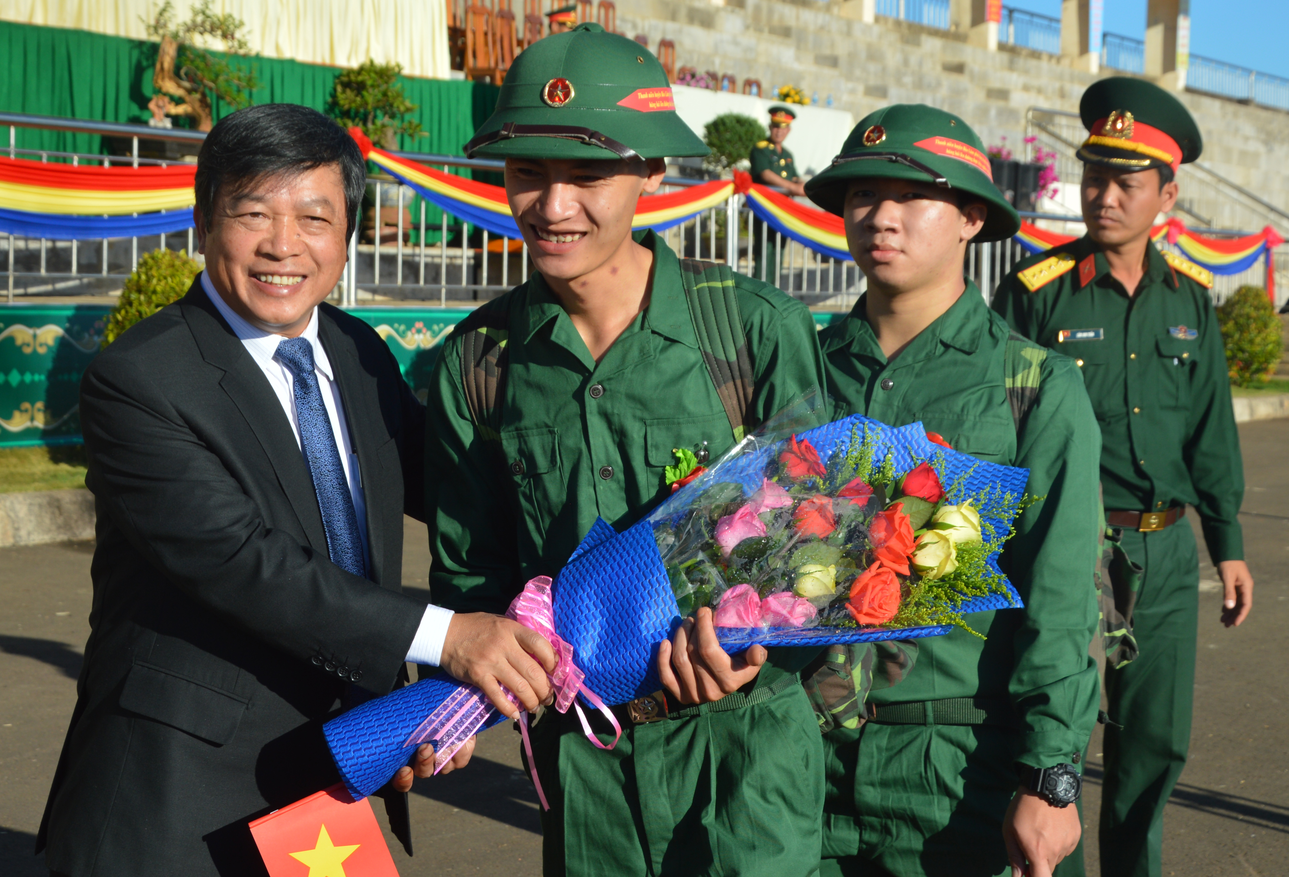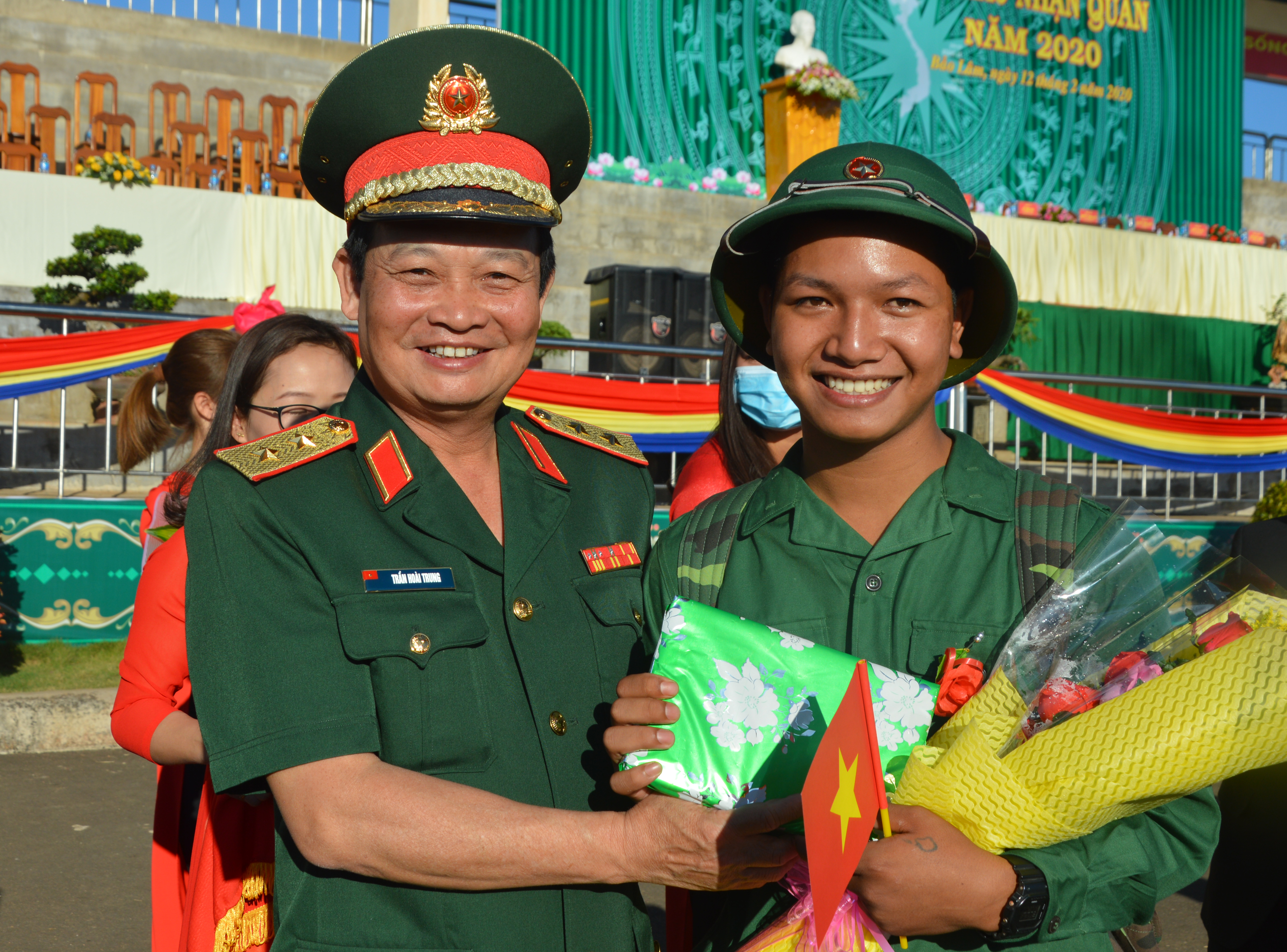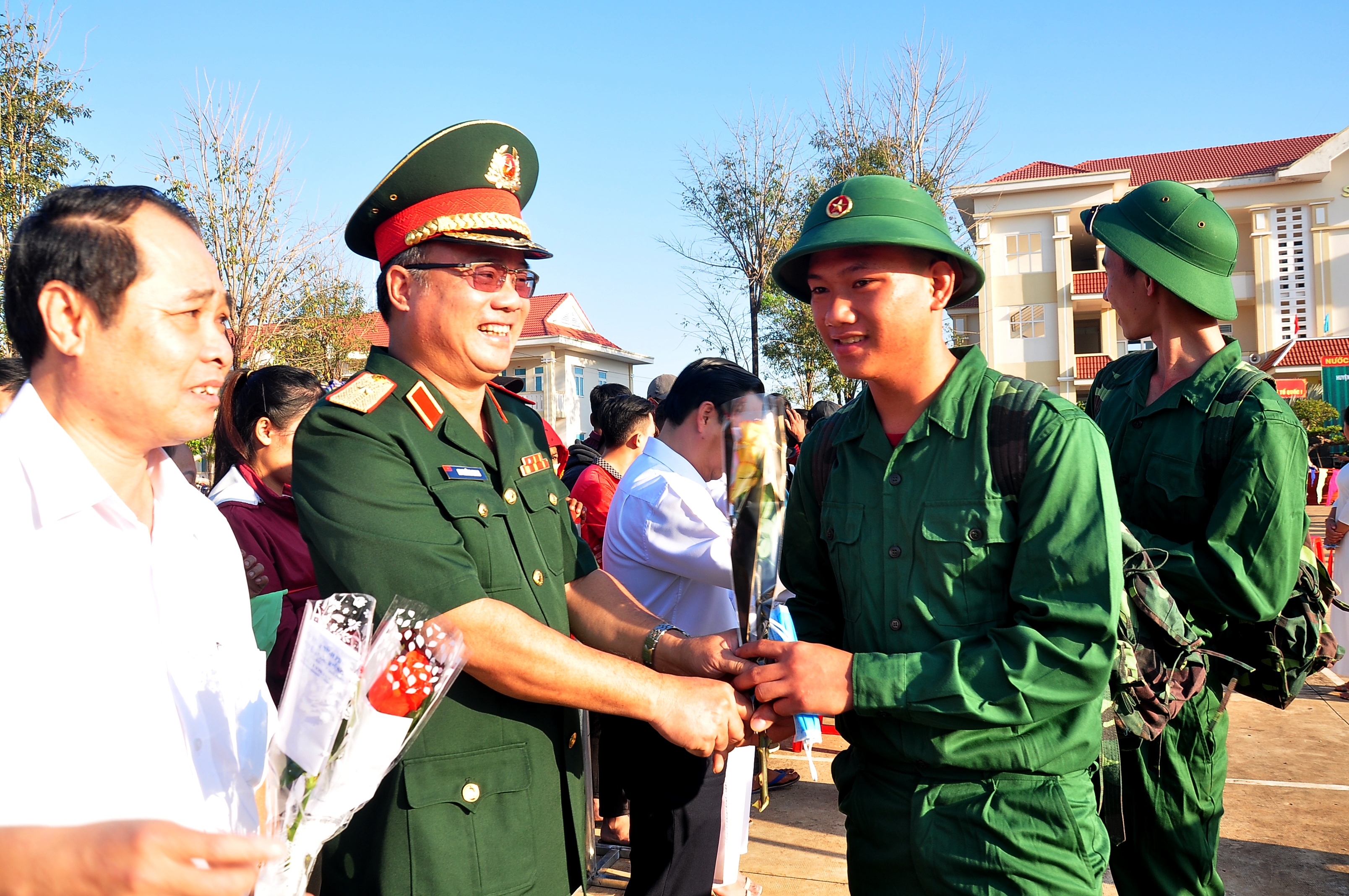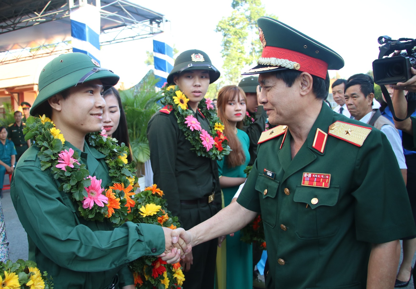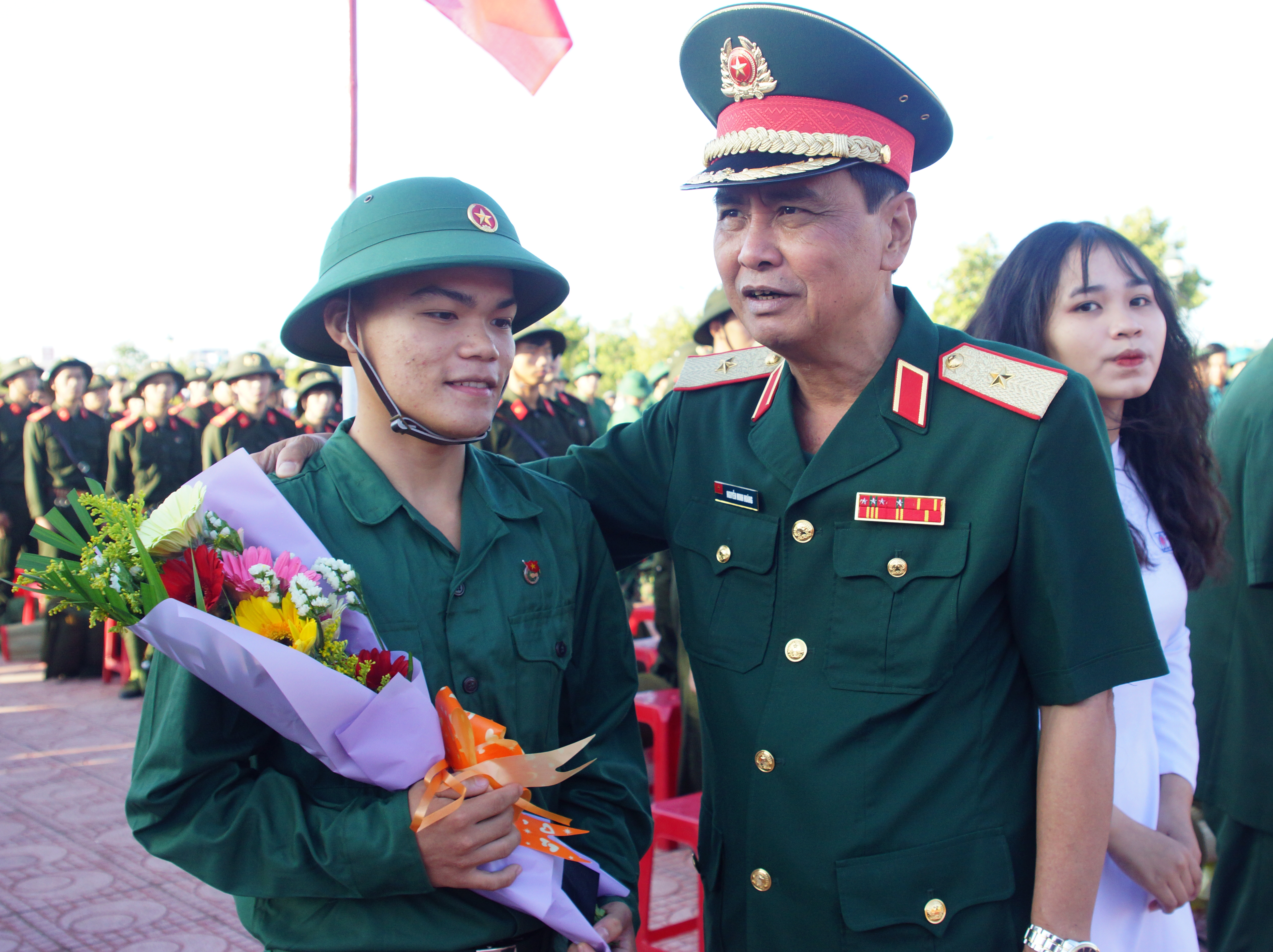 Trung tướng Trần Hoài Trung, Bí thư Đảng ủy, Chính ủy Quân khu 7 chúc mừng tân binh huyện Bảo Lâm, tỉnh Lâm Đồng. Ảnh: Thế Anh