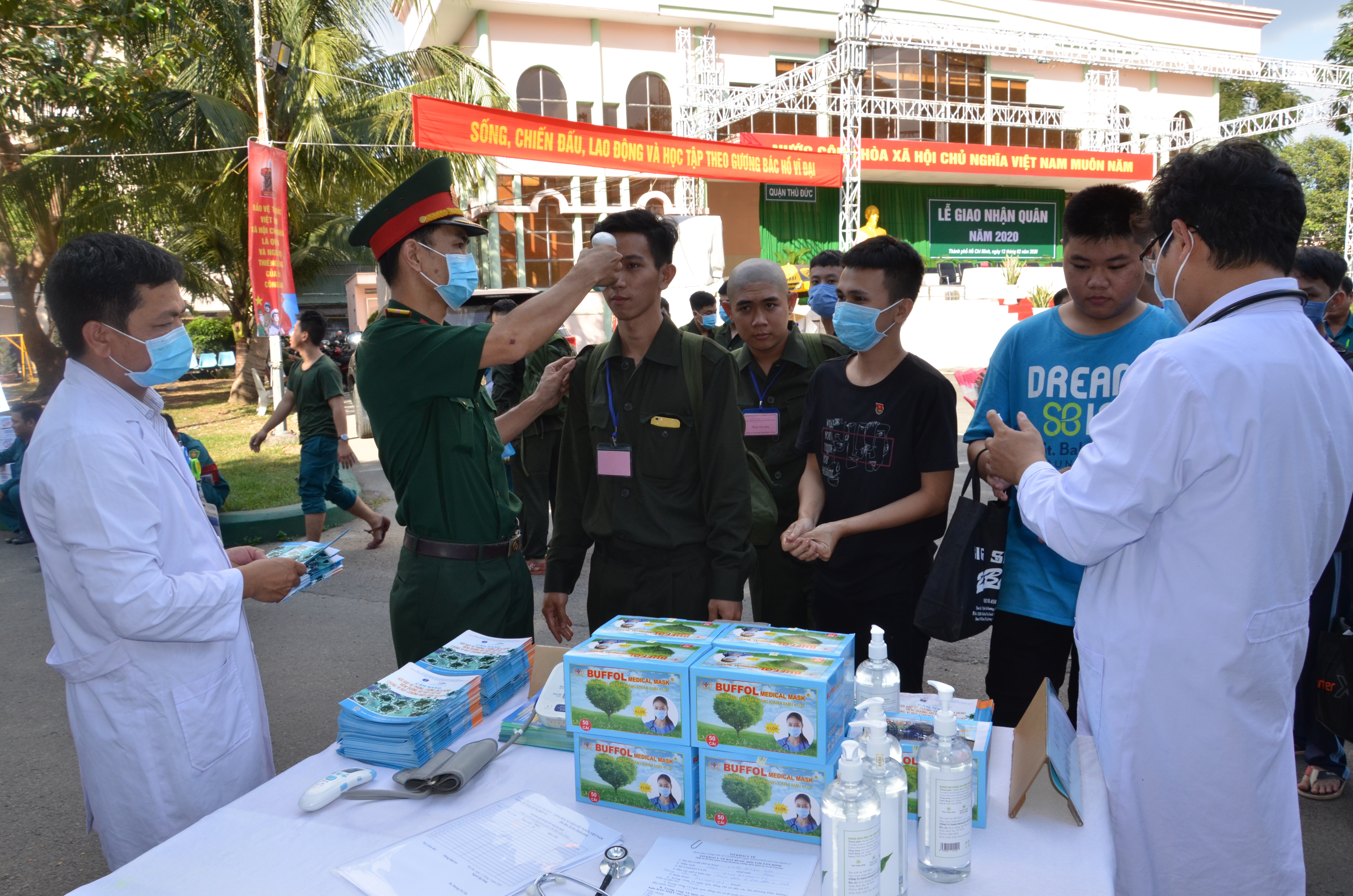 Các tân binh trước khi về đơn vị đều được đo thân nhiệt nhằm bảo đảm an toàn. Ảnh: Ngọc Tuân