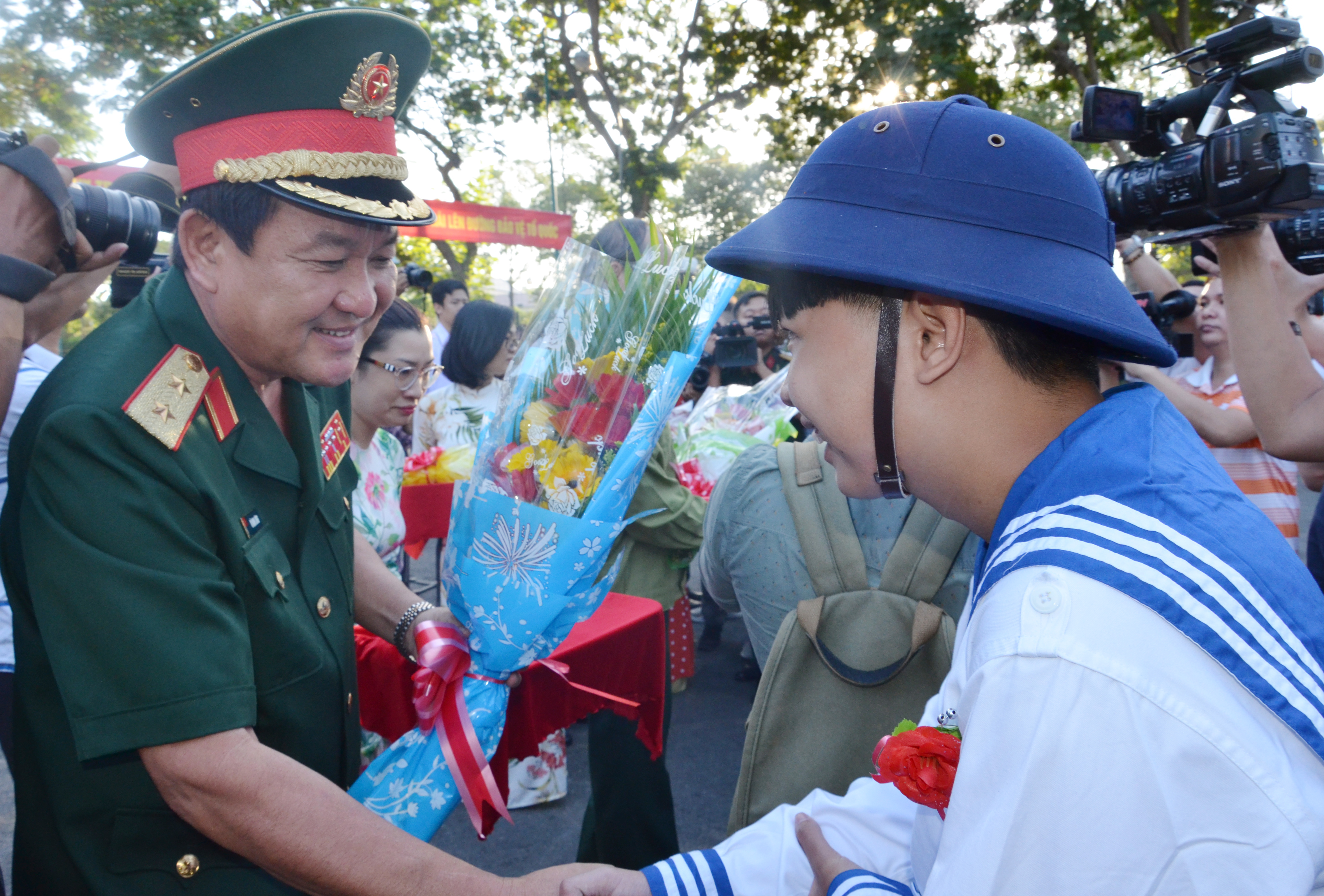 Trung tướng Võ Minh Lương, UVTW Đảng, Tư lệnh Quân khu 7 tặng hoa chúc mừng các tân binh TPHCM. Ảnh: Ngọc Tuân