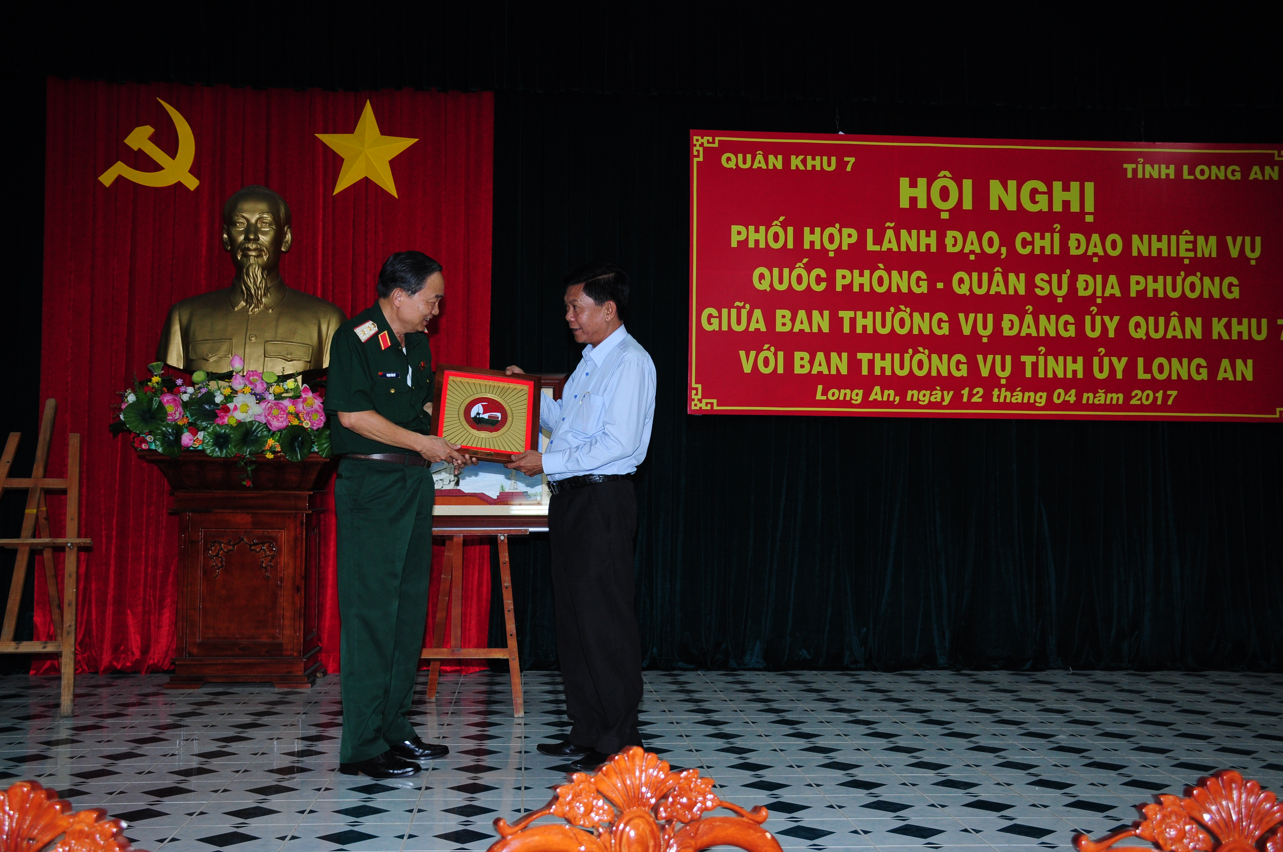 Trung tướng Phạm Văn Dỹ, Bí thư Đảng ủy, Chính ủy Quân khu 7 tặng biểu trưng Quân khu 7 cho Tỉnh ủy Long An