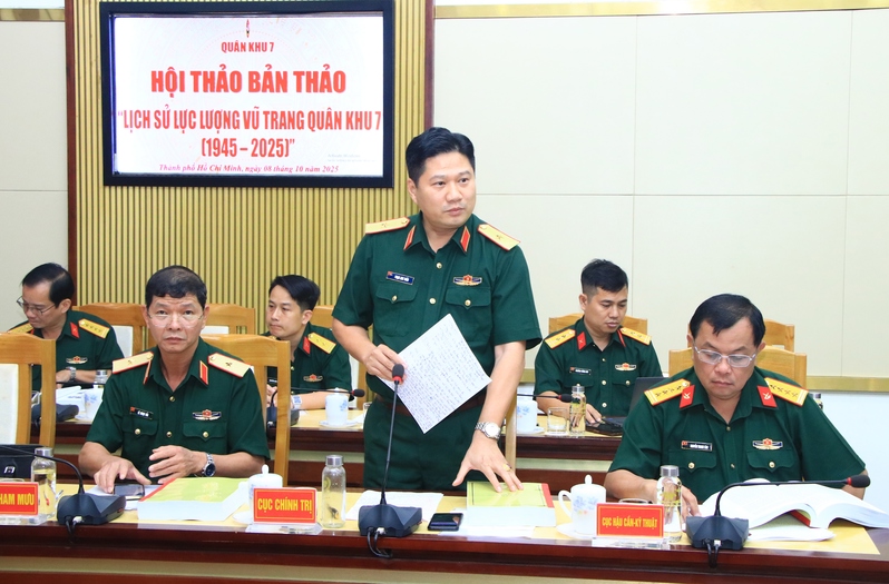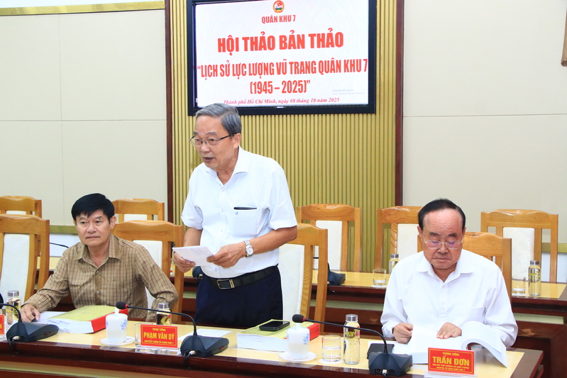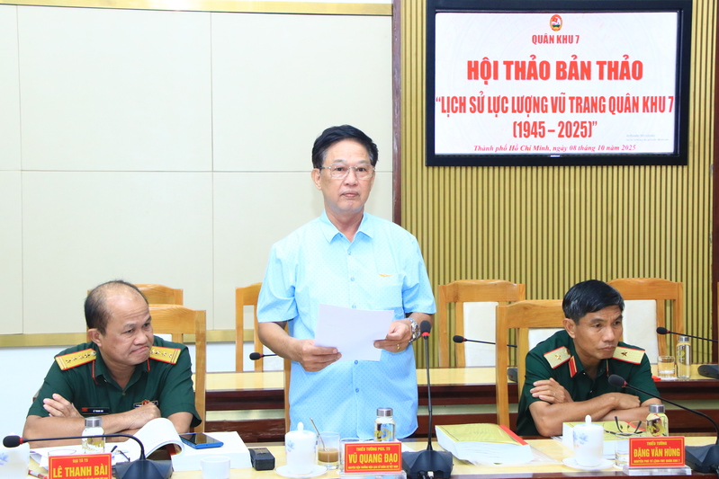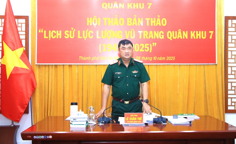 (QK7 Online) - Chiều ngày 8/10, Quân khu 7 tổ chức Hội thảo Bản thảo “Lịch sử LLVT Quân khu 7 (1945 - 2025)”, Thiếu tướng Lê Xuân Thế, Tư lệnh Quân khu chủ trì hội thảo. Dự hội thảo có Thượng tướng Trần Đơn, nguyên Thứ trưởng Bộ Quốc phòng, nguyên Tư lệnh Quân khu 7; các đồng chí trong Ban Thường vụ Đảng ủy, Bộ Tư lệnh Quân khu; nguyên Thủ trưởng Bộ Tư lệnh Quân khu qua các thời kỳ; đại diện Viện Chiến lược - Lịch sử Quốc phòng Việt Nam; các nhà khoa học; Thủ trưởng các cơ quan Quân khu; lãnh đạo, chỉ huy các địa phương, đơn vị trong LLVT Quân khu.