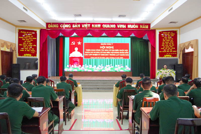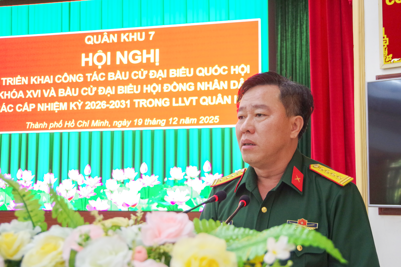 (QK7 Online) - Sáng ngày 19/12, Quân khu 7 tổ chức Hội nghị triển khai công tác bầu cử đại biểu Quốc hội khóa XVI và bầu cử đại biểu Hội đồng nhân dân các cấp nhiệm kỳ 2026 - 2031. Thừa ủy quyền thủ trưởng Bộ Tư lệnh Quân khu, Đại tá Thái Thành Đức, Phó Chủ nhiệm Chính trị Quân khu chủ trì hội nghị. Dự hội nghị có thủ trưởng các cơ quan: Bộ Tham mưu, Cục Hậu cần - Kỹ thuật Quân khu, Ủy ban Kiểm tra Đảng ủy Quân khu, Văn phòng, Thanh tra Quốc phòng Quân khu cùng các lãnh đạo, chỉ huy các cơ quan, đơn vị trực thuộc.