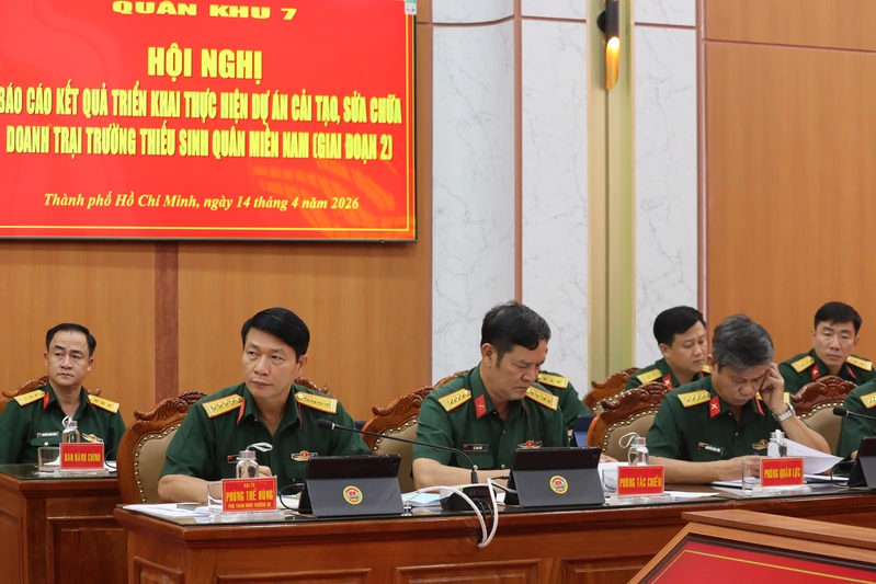 (QK7 Online) - Sáng 14/4, Quân khu 7 tổ chức hội nghị báo cáo kết quả triển khai thực hiện dự án cải tạo, sửa chữa doanh trại Trường Thiếu sinh quân miền Nam (giai đoạn 2). Thiếu tướng Lê Xuân Bình, Ủy viên Ban Thường vụ Đảng ủy, Phó Tư lệnh, Tham mưu trưởng Quân khu chủ trì hội nghị.