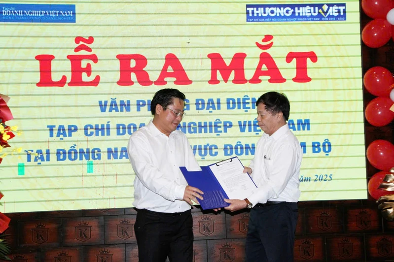 Nhà báo Phan Huy Hiền - Tổng Biên tập Tạp chí Doanh nghiệp Việt Nam (bên phải) trao quyết định thành lập VPĐD cho Nhà báo Trần Hữu Thọ - Trưởng VPĐD tại Đồng Nai.