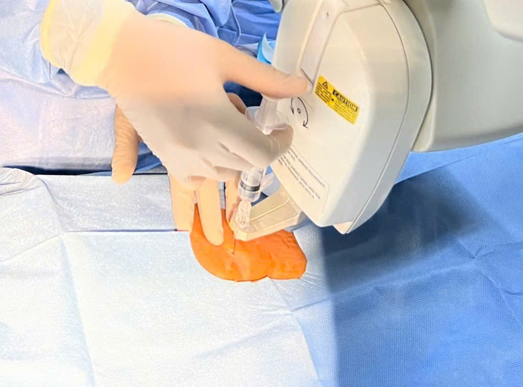 Với quy trình cải tiến, Robot được sử dụng để định vị dẫn đường đưa kim sinh thiết xương (8-13G) tới vị trí màng xương. Ở bước này, thao tác hoàn toàn mượt mà nhờ độ chính xác cao và bệnh nhân được cố định chắc chắn. Sau đó kiểm tra trên hình ảnh chụp cắt lớp vi tính (CLVT) và xác nhận kim đã tiếp cận đúng tổn thương, cánh tay Robot ngừng hoạt động. Tiếp đó, bác sĩ thực hiện thao tác khoan, cắt bằng tay để xuyên qua xương cứng, hoàn thành việc lấy mẫu.