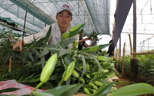 Nông dân làng hoa Vạn Thành (Đà Lạt) sơ chế hoa ly phục vụ Tết.
