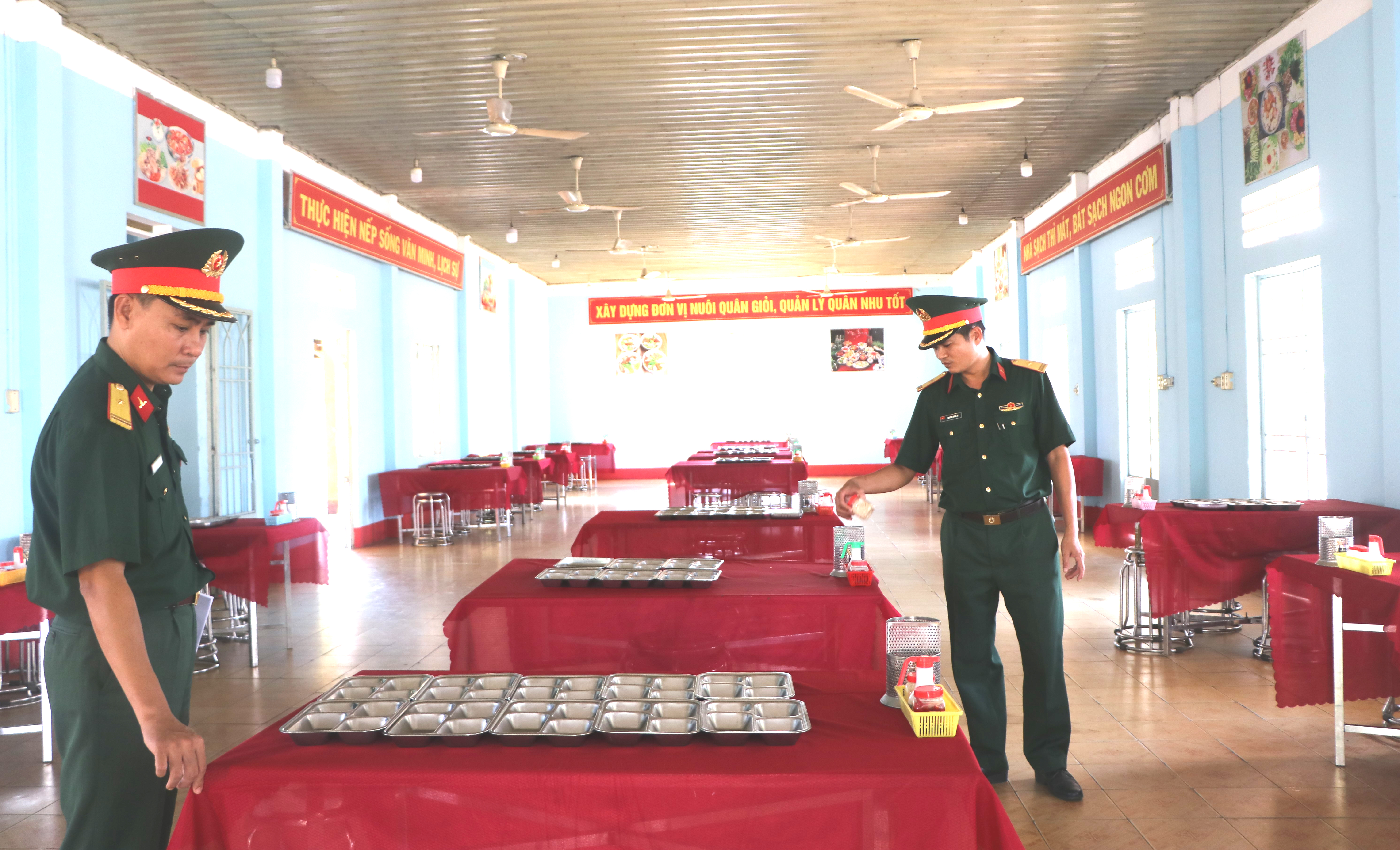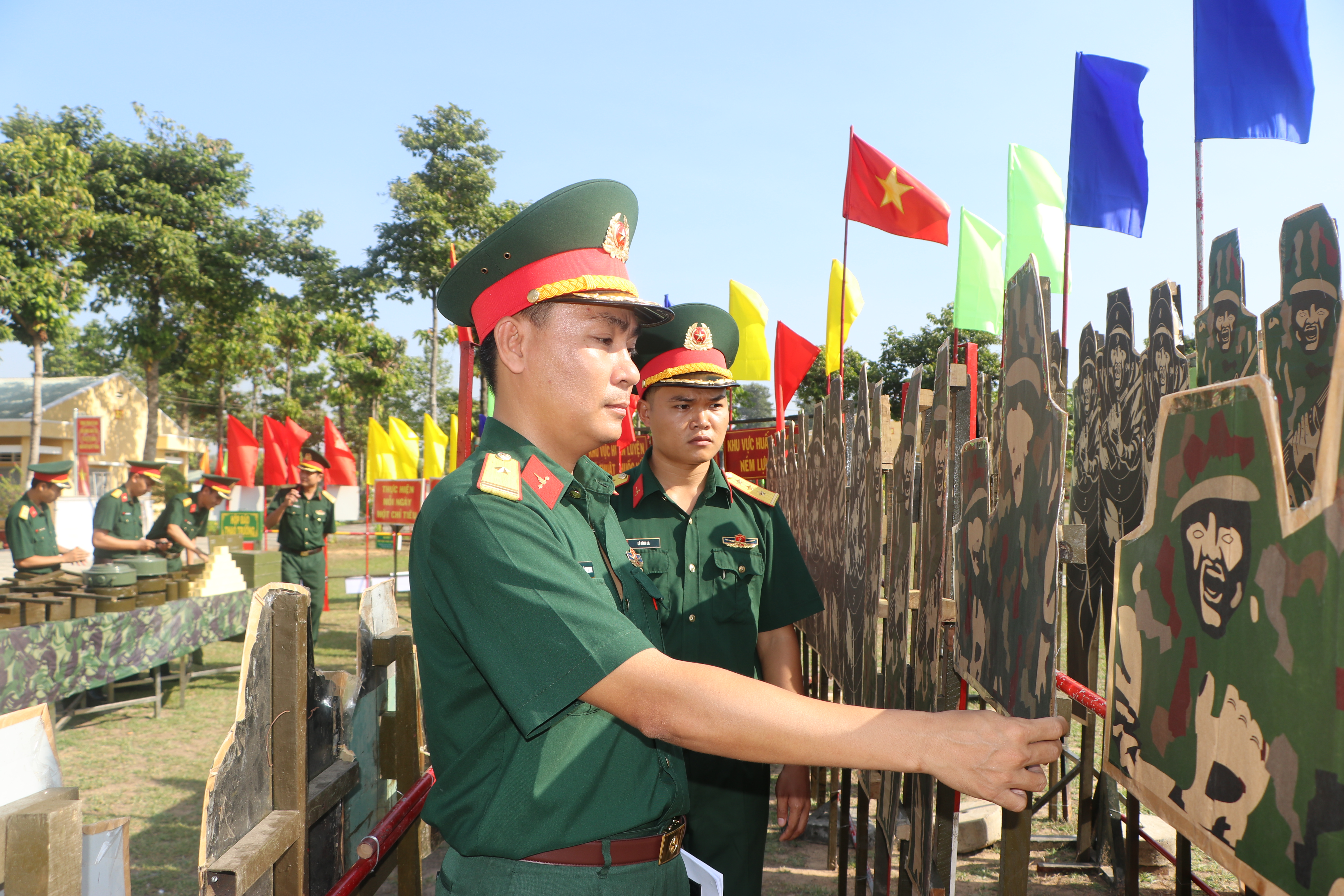 Chỉ huy đơn vị kiểm tra vật chất, mô hình, học cụ huấn luyện chiến sĩ mới.