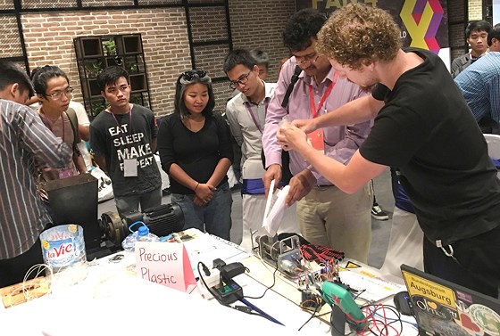 Nguyễn Trà Mi (thứ 4 từ phải sang) cùng các nhà sáng chế trong và ngoài nước chạy thử máy biến rác thải nhựa thành sợi nhựa nguyên liệu