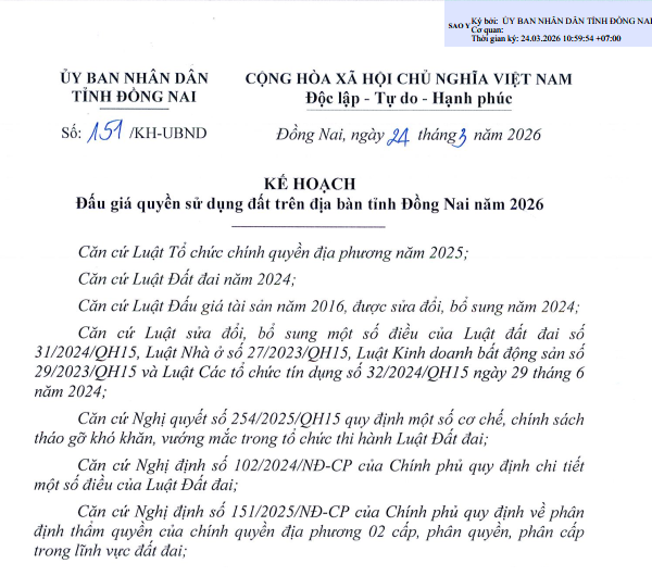 Ủy ban Nhân dân tỉnh Đồng Nai đã chính thức ban hành Kế hoạch số 151/KH-UBND về đấu giá quyền sử dụng đất trên địa bàn tỉnh năm 2026. Văn bản này căn cứ Luật Đất đai 2024, Luật Đấu giá tài sản 2016 (sửa đổi 2024), các nghị định hướng dẫn và Nghị quyết 254/2025/QH15 của Quốc hội, nhằm khai thác hiệu quả quỹ đất, đáp ứng nhu cầu nhà ở, phát triển đô thị - dịch vụ, đồng thời bổ sung nguồn vốn lớn cho ngân sách tỉnh phục vụ đầu tư công và phúc lợi xã hội.