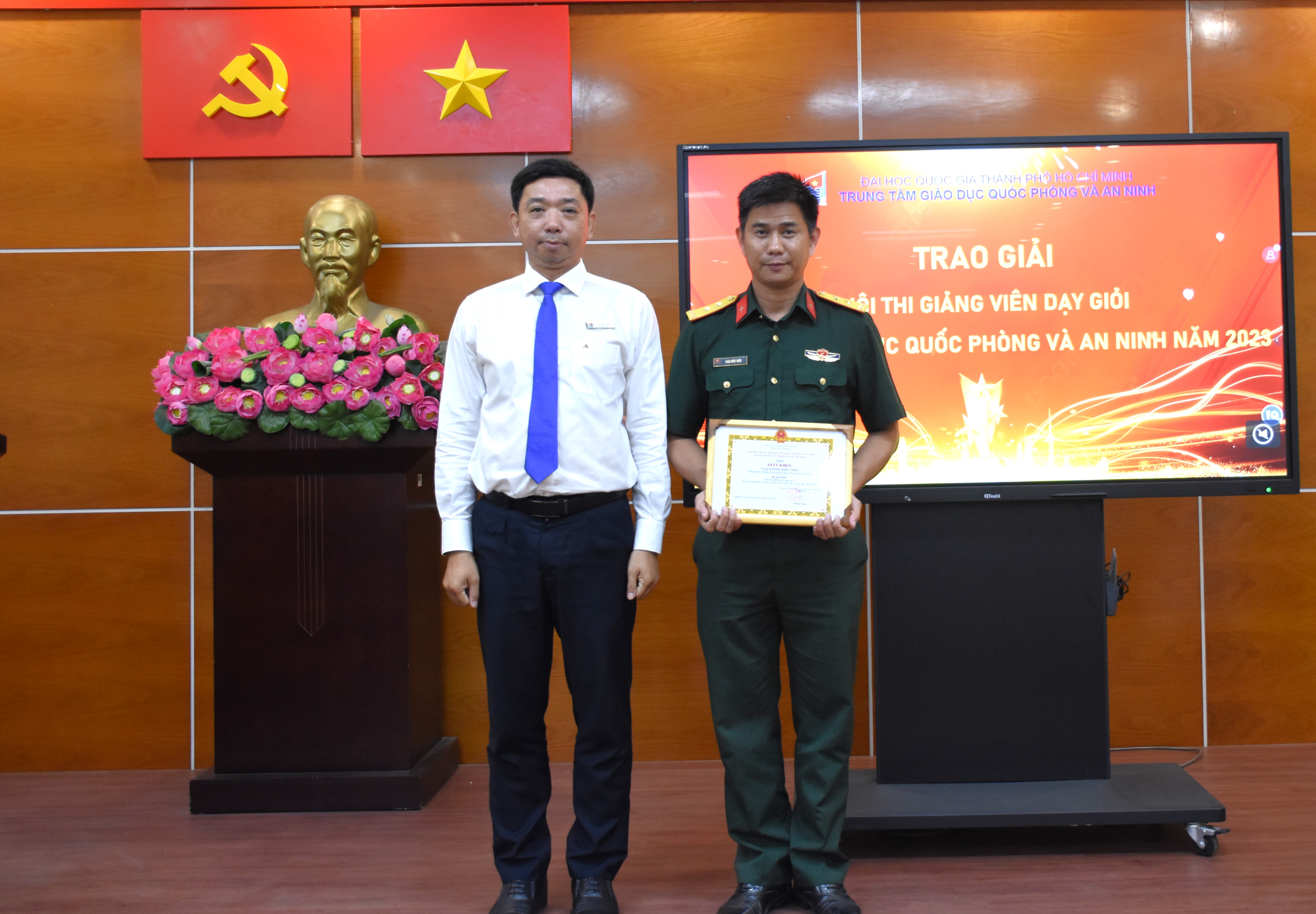 Tiến sĩ Đỗ Đại Thắng, Giám đốc Trung tâm Giáo dục Quốc phòng và An ninh Đại học Quốc gia TPHCM trao giải nhất hội thi.