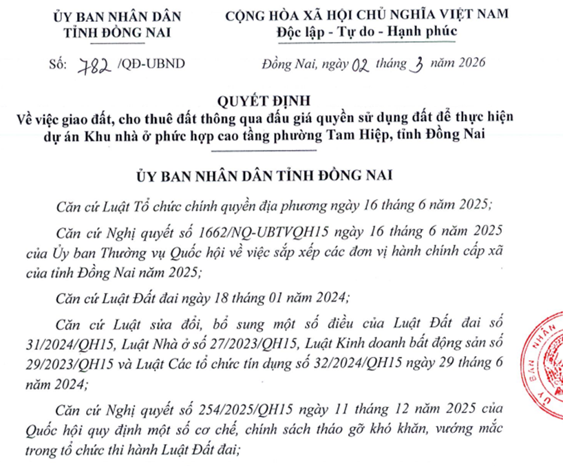 Ủy ban Nhân dân tỉnh Đồng Nai đã ban hành Quyết định số 782/QĐ-UBND, chính thức giao đất và cho thuê đất thông qua đấu giá quyền sử dụng đất để thực hiện dự án Khu nhà ở phức hợp cao tầng tại phường Tam Hiệp.
