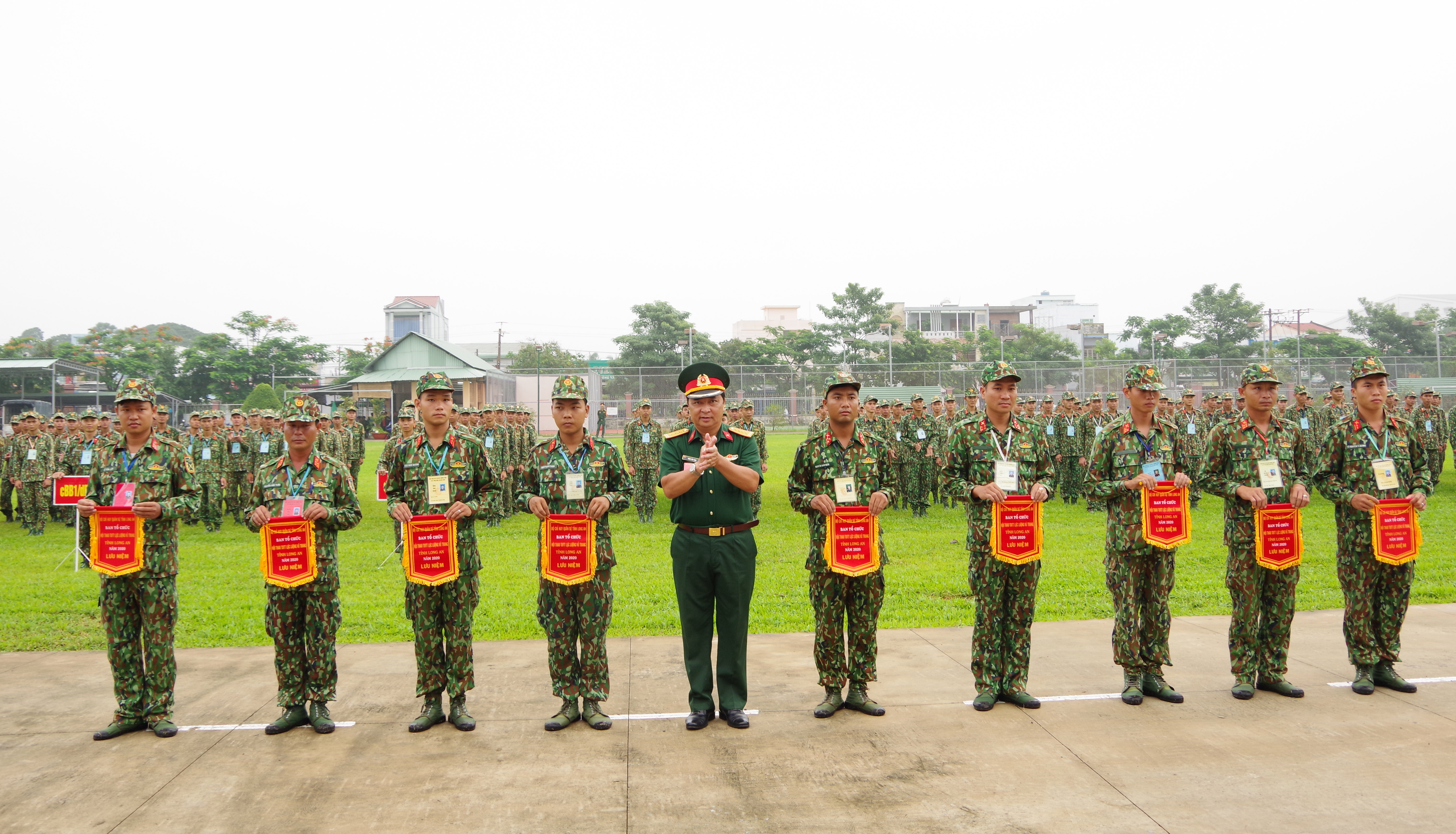 Bộ CHQS tỉnh Long An tặng cờ lưu niệm cho các đơn vị.