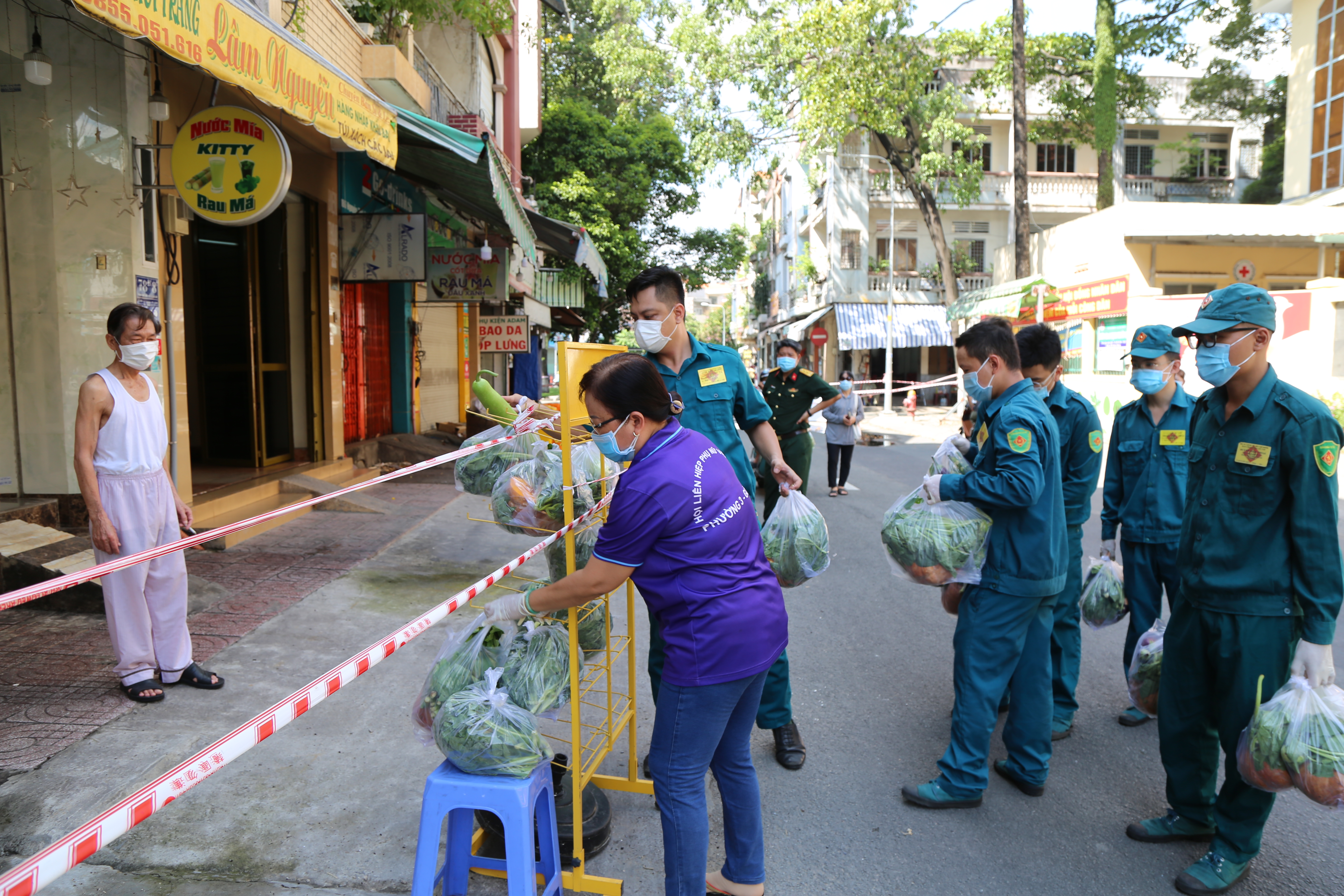 Lực lượng dân quân Ban CHQS phường 3, quận Gò Vấp mang các sản phẩm tăng gia sản xuất của Sư đoàn 302 đến cho người dân tại khu cách ly tập trung.
