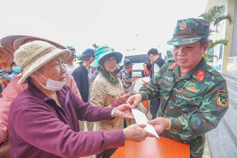 Đại tá Lê Tấn Dung, Phó Chính ủy Sư đoàn 302 trao quà tặng cho người dân bị ảnh hưởng bởi lũ.