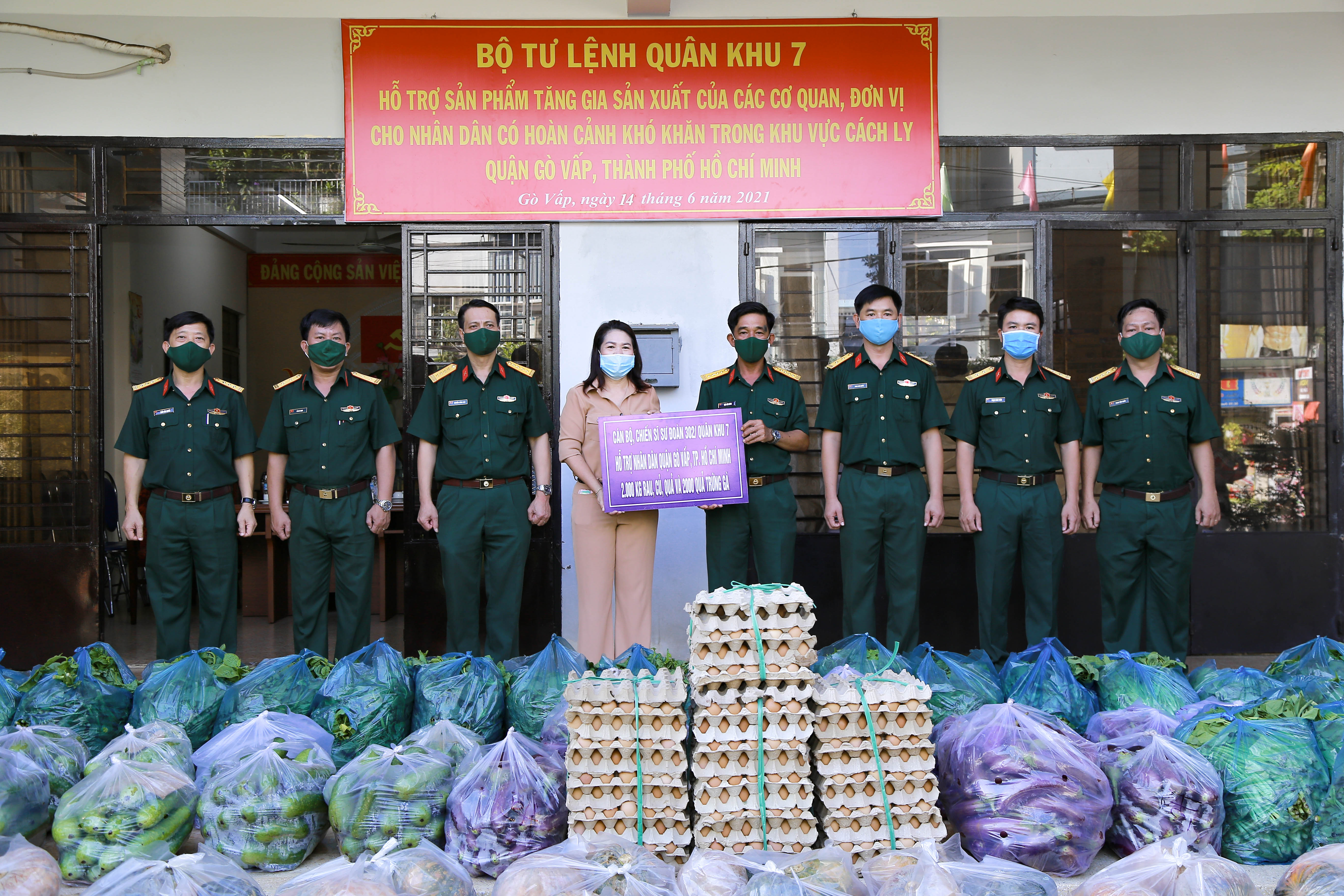 (QK7 Online) – Sáng 14/6, tại Ủy ban Mặt trận Tổ quốc (UBMTTQ) Việt Nam quận Phú Nhuận và Gò Vấp, Sư đoàn 302, Quân khu 7 đã đến trao tặng các sản phẩm tăng gia sản xuất hỗ trợ người dân trong các điểm cách ly tập trung trên địa bàn 2 quận. Đến dự có Đại tá Nguyễn Công Anh, Phó Chủ Nhiệm Chính trị Quân khu 7.