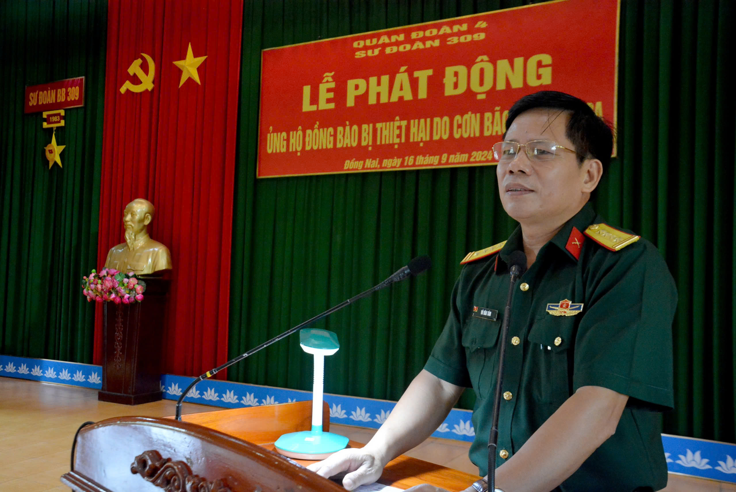 Phát biểu tại buổi Lễ phát động đồng chí Đại tá Vũ Văn Tám, Chính ủy Sư đoàn yêu cầu các đơn vị trong sư đoàn tiếp tục làm tốt công tác giáo dục, tuyên truyền và quán triệt tới 100% cán bộ, chiến sĩ với tinh thần “tương thân, tương ái”, “lá lành đùm lá rách” cùng chung tay giúp đỡ đồng bào các địa phương khắc phục thiệt hại.