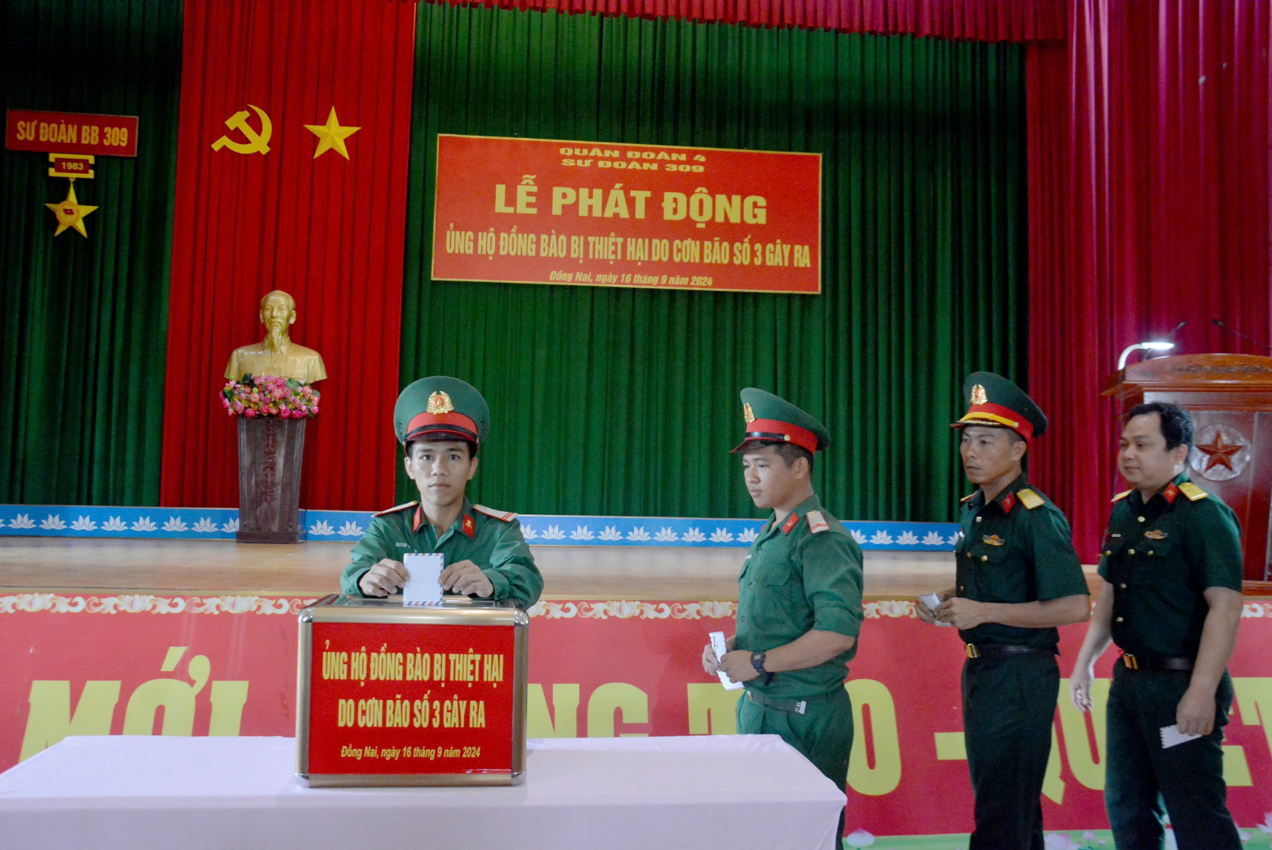 (QK7 Online) - Hưởng ứng lời kêu gọi của Tổng Bí thư, Chủ tịch nước Tô Lâm với tinh thần hỗ trợ “Cao nhất, nhanh nhất” cho các gia đình bị thiệt hại do bão lũ; Lời kêu gọi của Ủy ban Mặt trận Tổ quốc Việt Nam về vận động ủng hộ đồng bào khắc phục thiệt hại do cơn bão số 3 gây ra, sáng 16/9, tại TP. Biên Hòa, Sư đoàn 309, Quân đoàn 4 tổ chức Lễ phát động ủng hộ đồng bào bị thiệt hại do bão số 3 gây ra.