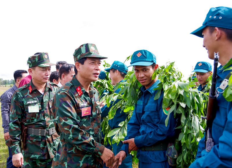 Đại tá Phùng Thế Hùng, Phó Tham mưu trưởng Quân khu và Đại tá Huỳnh Việt Tâm, Sư đoàn trưởng Sư đoàn 309 biểu dương các lực lượng tham gia diễn tập.