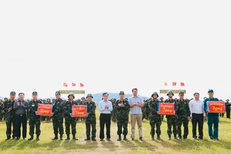 Đại tá Phùng Thế Hùng cùng thủ trưởng cơ quan Quân khu, chỉ huy, lãnh đạo các địa phương tặng quà cho lực lượng tham gia diễn tập.